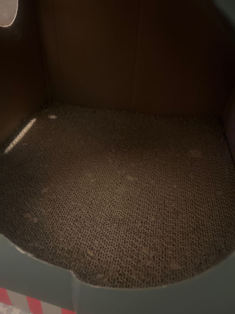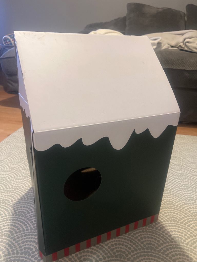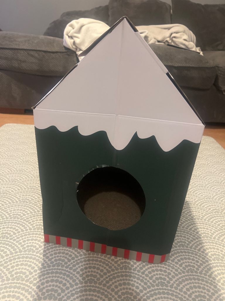 Cardboard play house for cats. It has a scratch board inside that’s hardly used.