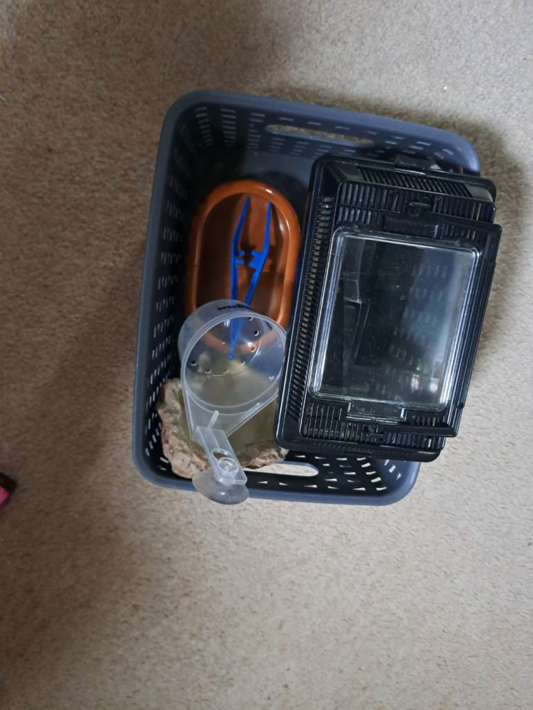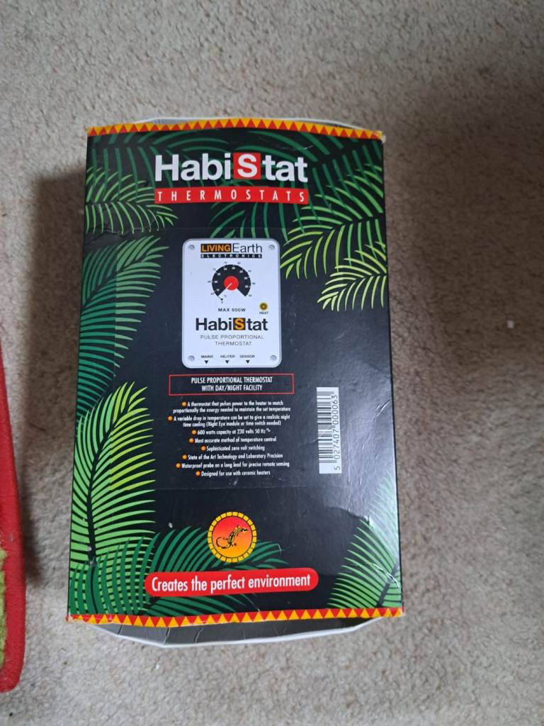 We have for sale a fully kitted out vivarium and storage base with ceramic heat lamp, fluorescent UV light, temperature guage, thermostat, another brand new thermostat (pictured) timers, feeding accessories, feeding bowl, water bowl, hide, basking platform, artificial plants and climbing vines. We have used it with the vinyl base but we will include 2 new bags of blue sand if you wish to use sand. Everything your pet will need for a comfortable life. Cost several hundred pounds to set up but now need the space so grab yourself a bargain. Vivarium measures approximately 1200 x 600 x 600 mm, base is the same. Can be further dismantled for transport if necessary. Any questions please ask.