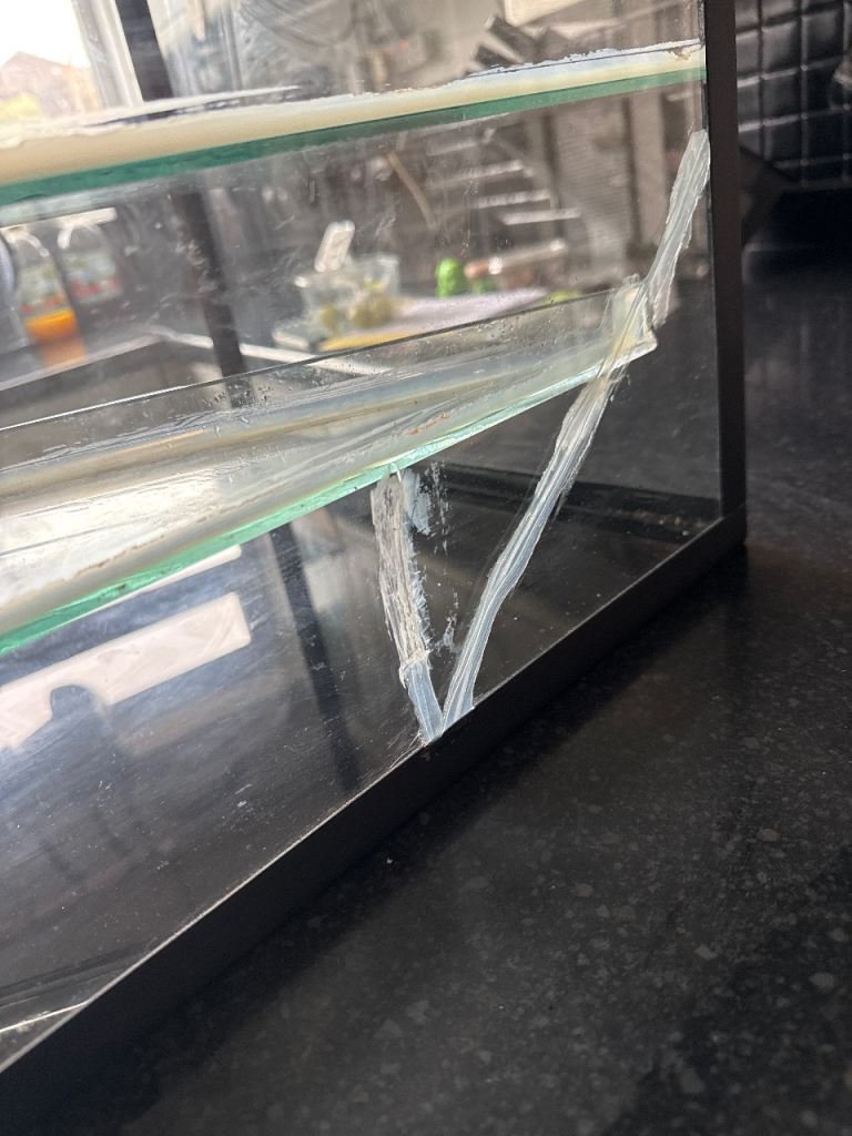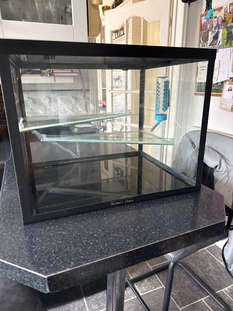 Glass tank for gerbils/mice/hamster, see photo for slight damage on side but still good to use. 2 shelves, 40cm D x 39cm H x 50cm W including water bottle