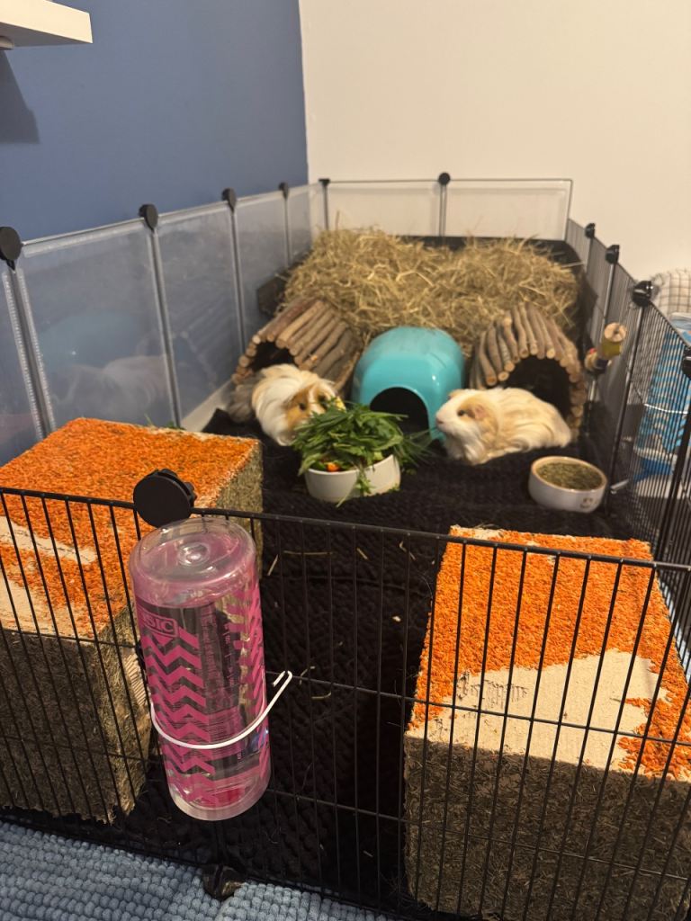 Currently set up as a 5x2 C&C cage but does have the same at the bottom for storage and extras parts from buying multiple sets. I have 2 sets of fleece bedding, loads of toys, tunnels, puppy pads, sawdust, hay, extra bowls and water bottles, towels, blankets food, treats and grooming equipment. Probably much more than this also. I have 2 male guinea pigs that are needing rehome due to change in career. Thanks