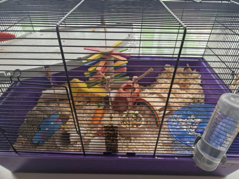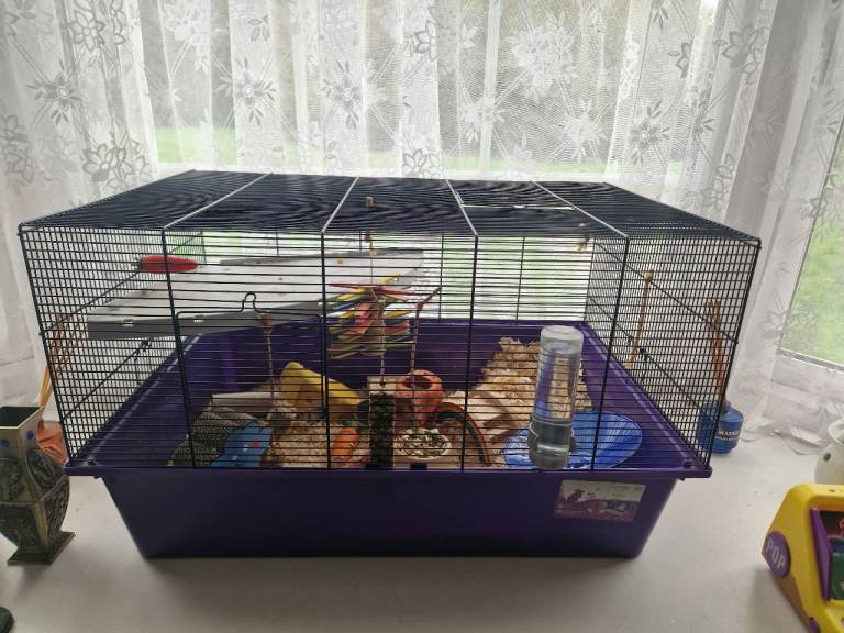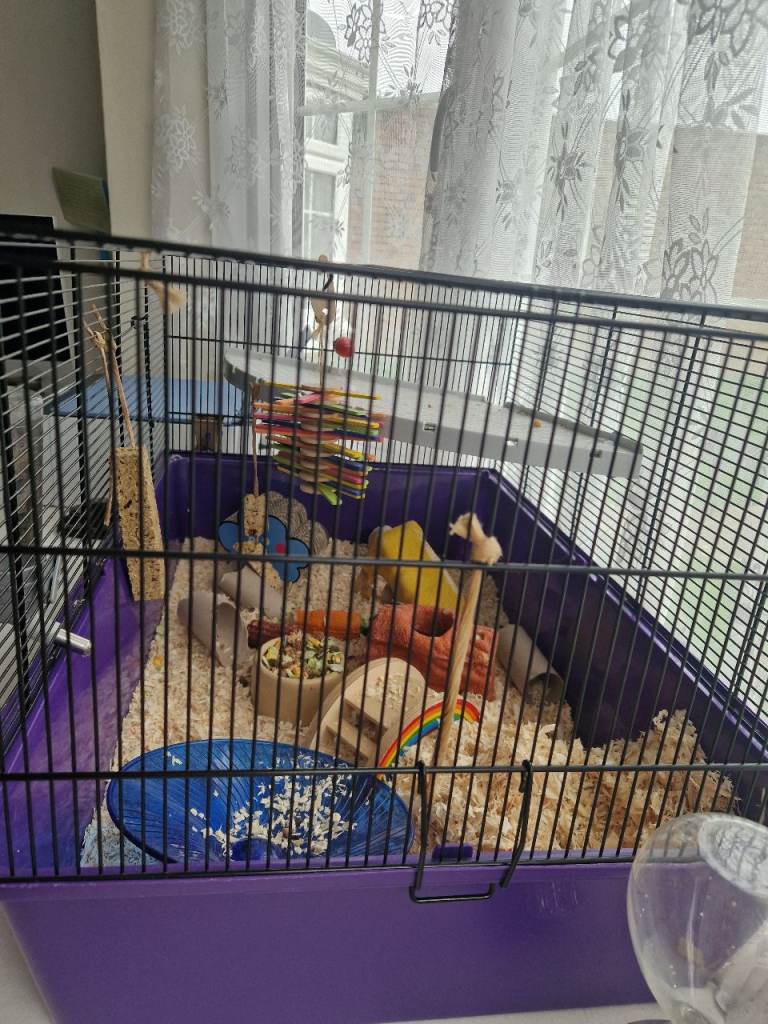 Large hamster cage, water bottle, toys, sand bath, ufo spinning wheel & a near full bag of Harry hamster food. Everything you need for you hamster selling due to ours unfortunately passing away