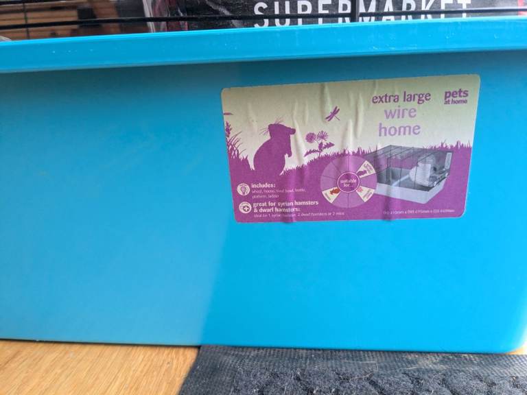 In great condition.... originally from pets at home 70 x 45 x 40 cm so really good size. Stainless steel food bowl, water bottle, bedding, silent nite wheel (completely silent), ball, playpen, small animal snacks