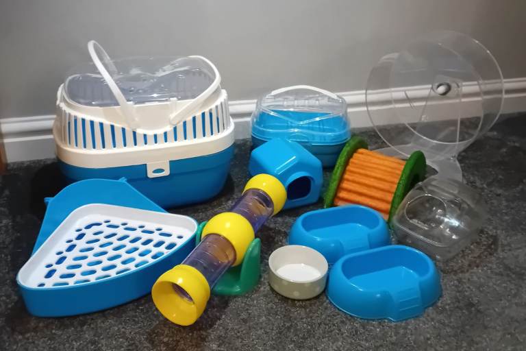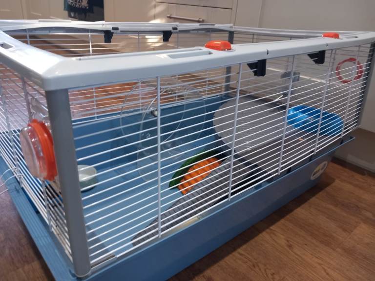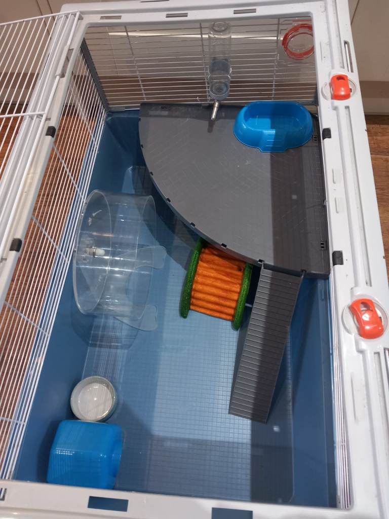 Includes a large Ferplast Criceti hamster cage that retails on Amazon for £84.75 (L78cmxW48cmxH39cm), with a platform, second blue cage base (perfect for use when cleaning the cage or playtime!), 2x ramps, 1x house, 2x food bowls, water bottle and water bottle cleaning brush.