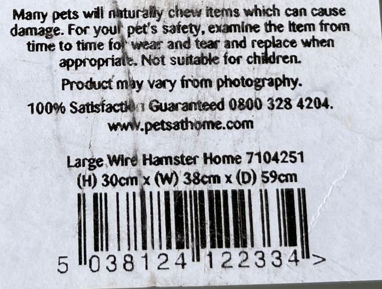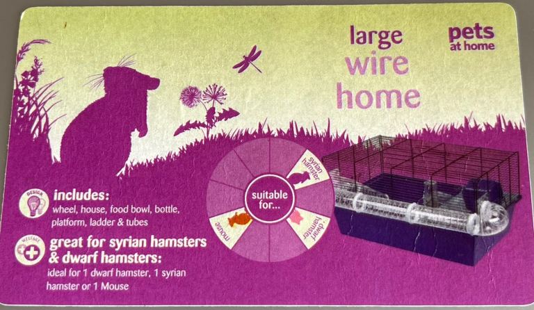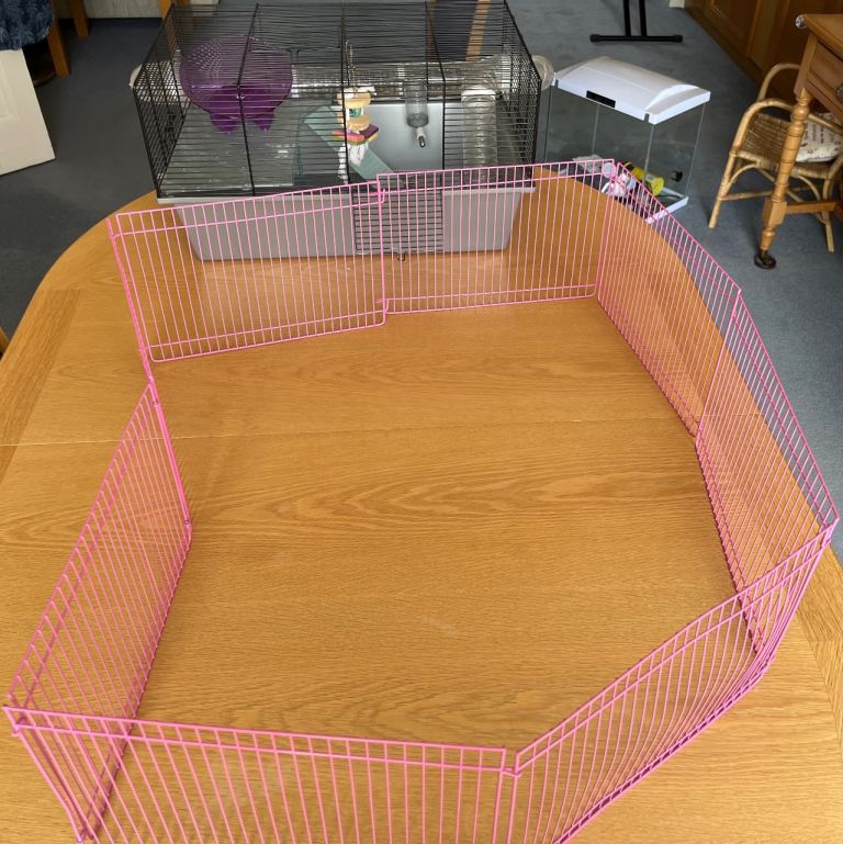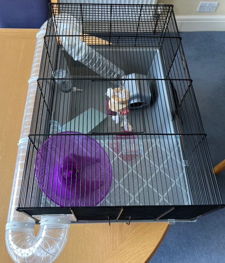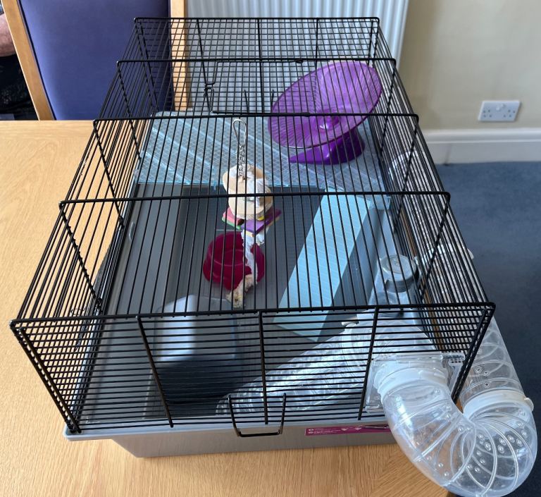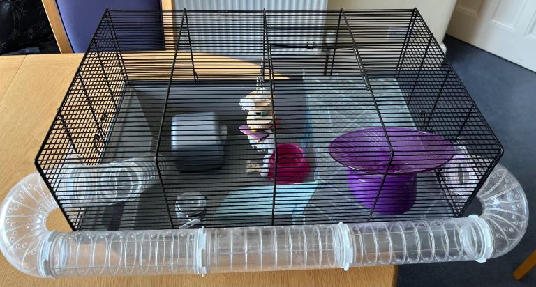 Hamster cage measuring 30cm high x 38cm wide x 59cm long, comes with wheel, house, food bowl, bottle, platform, ladder, tubes and wire play pen. All in good condition.
