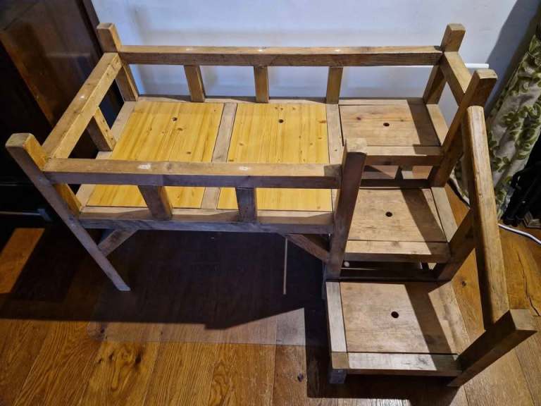 Beautifully handmade from solid wood, this dog bed features small built-in steps for easy access. It’s perfect with a large cushion or cozy blanket on top. Our dog absolutely loves it, but unfortunately, we no longer have space for it.
