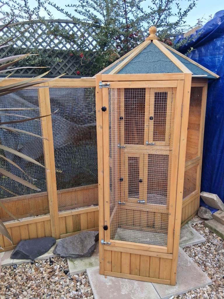 Hexagonal aviary and additional flight. Aviary is 127 cm x 187cm L x 108 cm..1cm galvanised wire mesh perfect for keeping small birds. Swinging perch and 2 nesting boxes included.