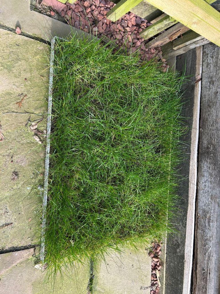 Approx 2.5’x1.5’. Real living Grass. In a metal tray. Perfect for cats/small dogs/little furry pets to sunbathe on or nibble at. Good if you have a small yard/catio, balcony. Easy to pick up