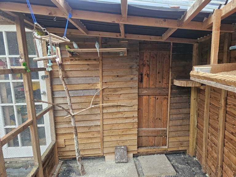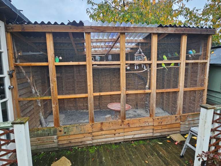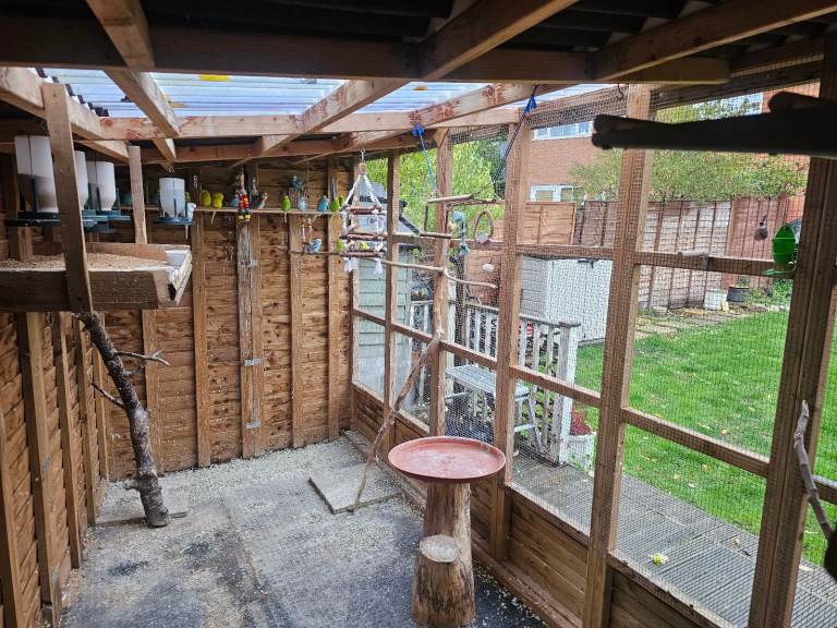 Large aviary with plenty of flight space. Feeding table, and various perches. It does only have 3 sides, as one side is attached to the shed, so you will need to make up a forth side or attach it to something else.