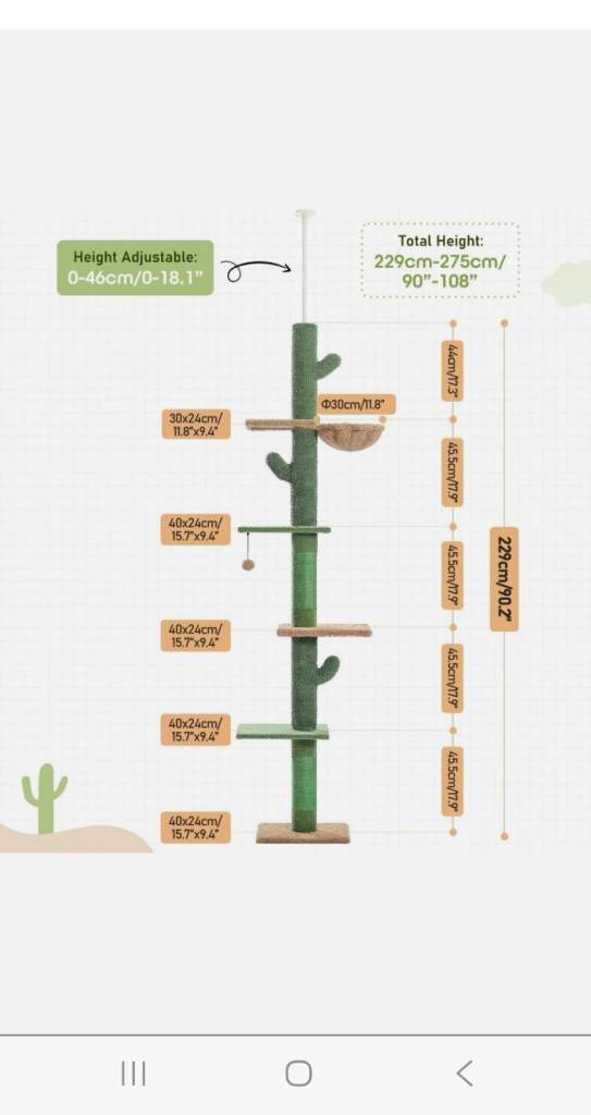 Floor to ceiling cactus cat tree. Lovely soft carpet material. In very good clean condition. All measurements are included in the photos. No Screws needed, just twists in to how you want it. Ready to go asap.