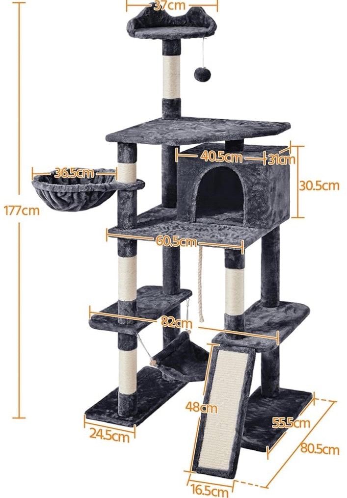 Really big cat tree grey colour with beige scratching posts. One scratching post is pretty bare. The rest, and all other parts are in good working order. Sadly no longer needed, so needs a new home.