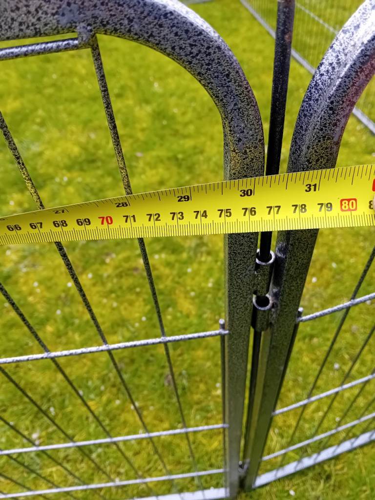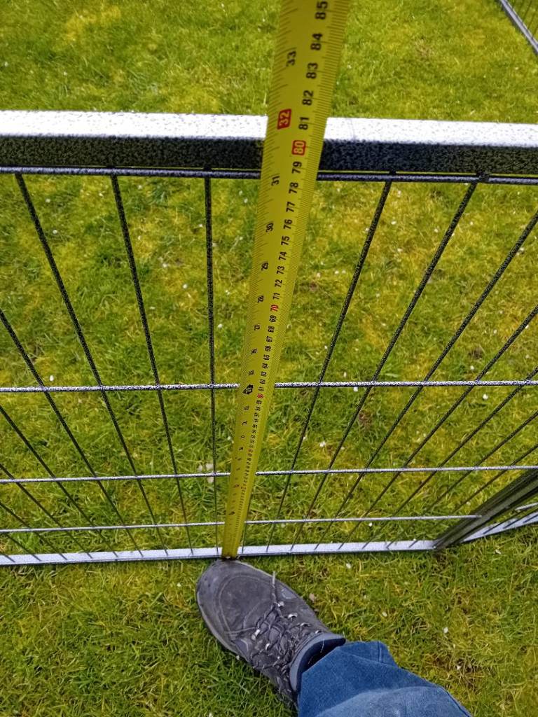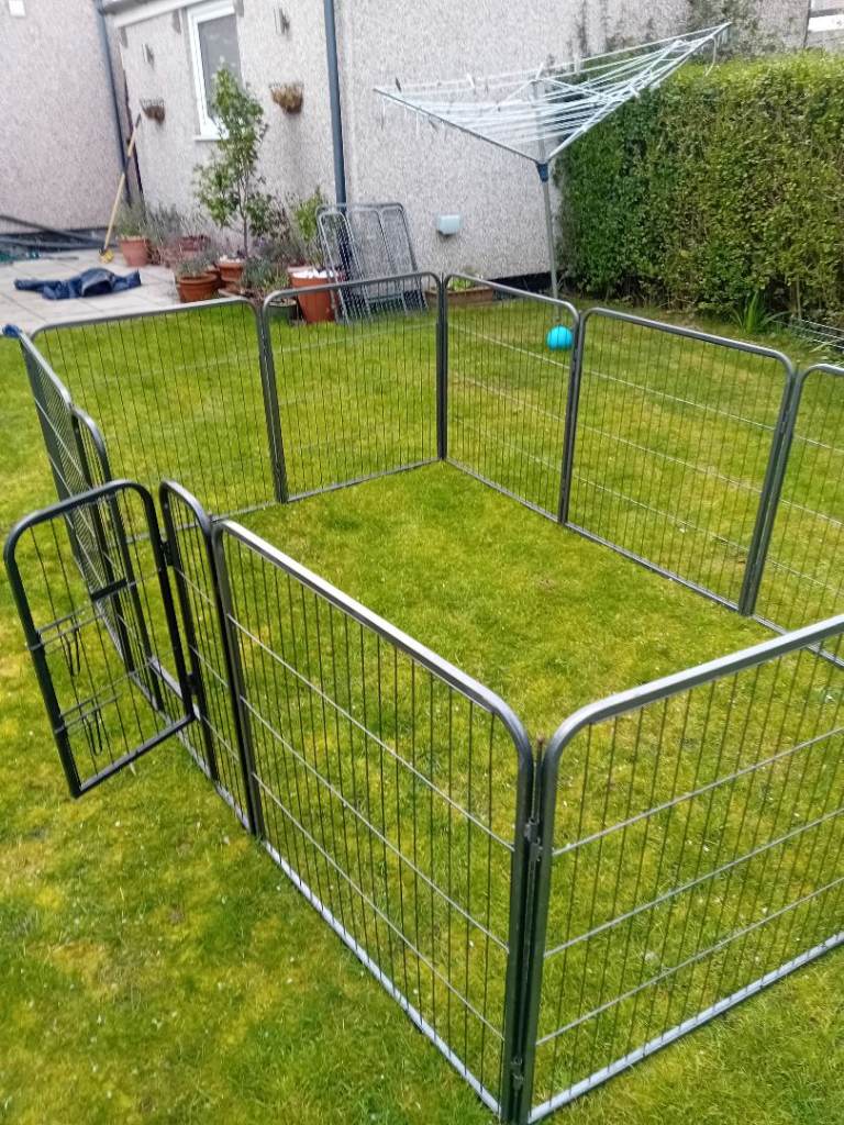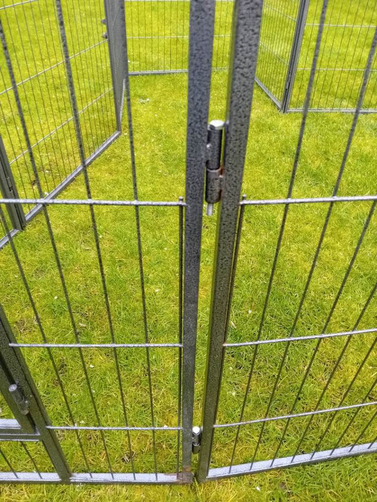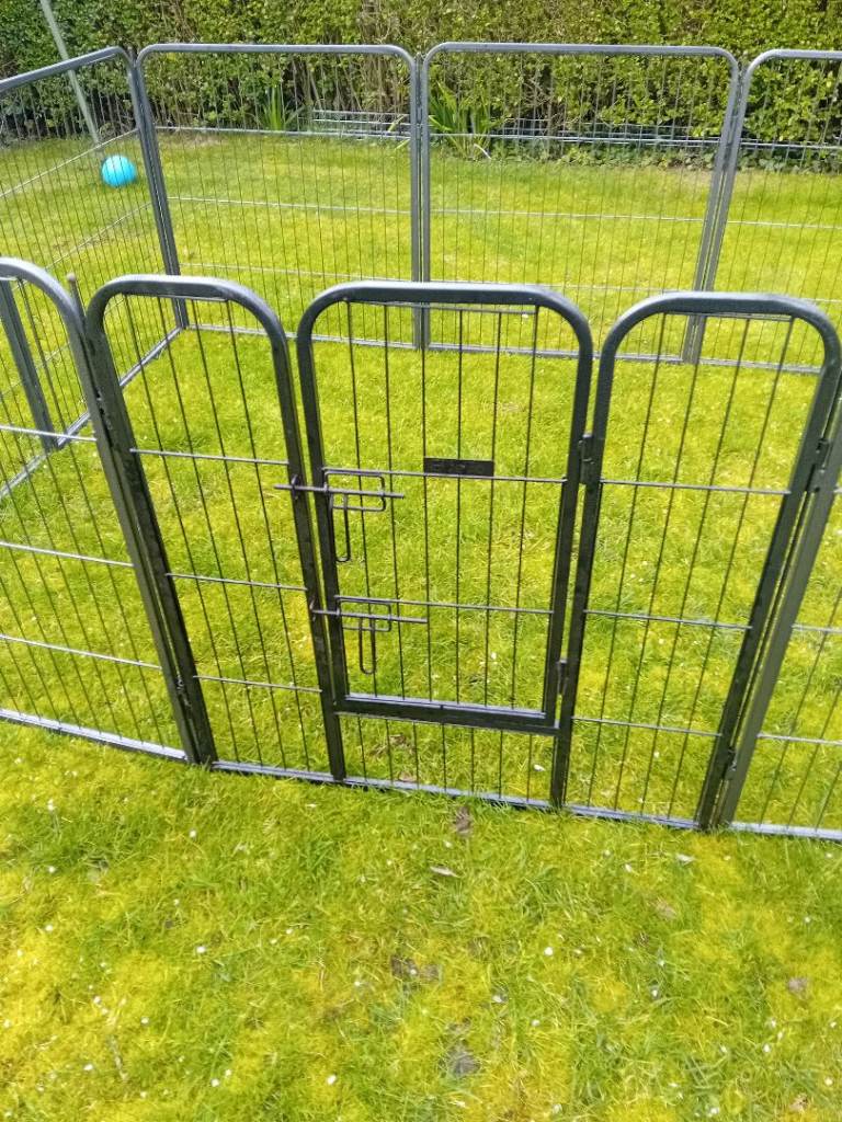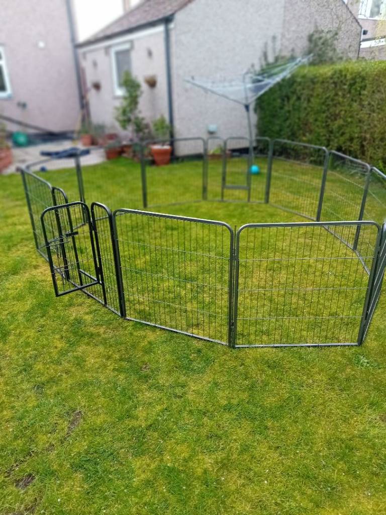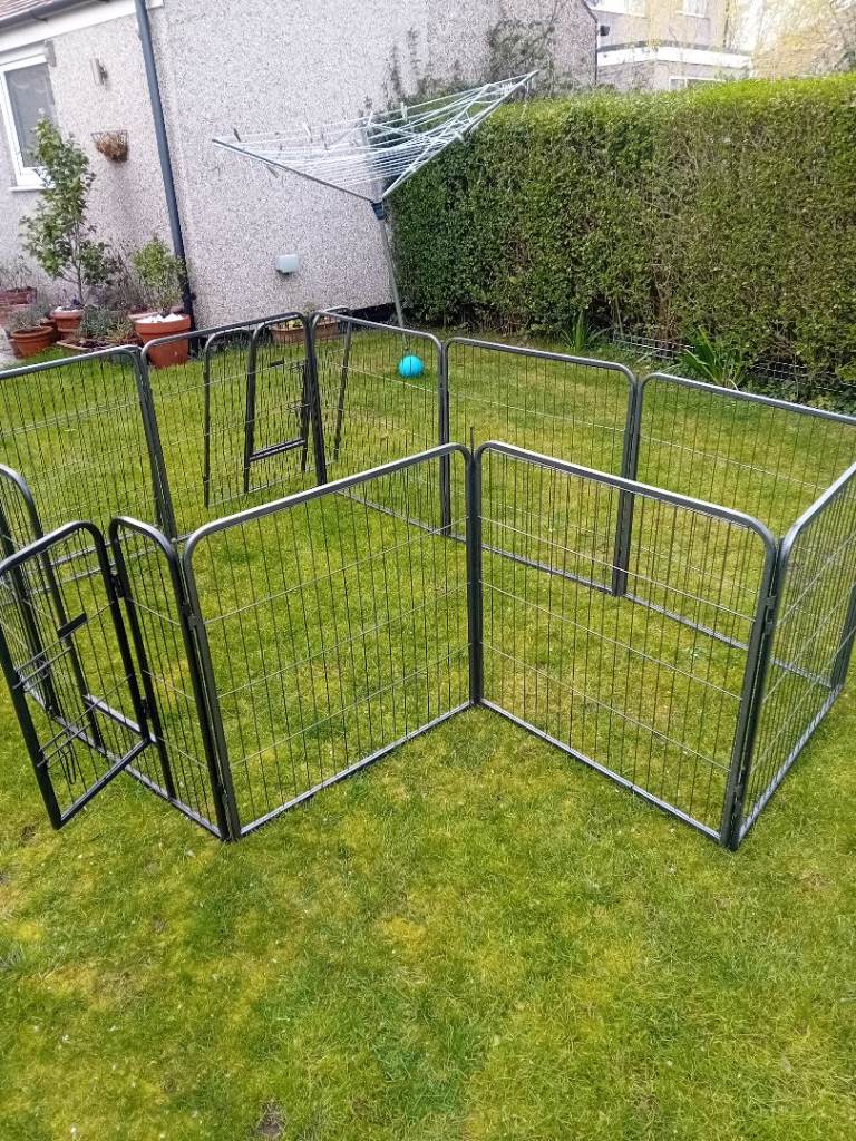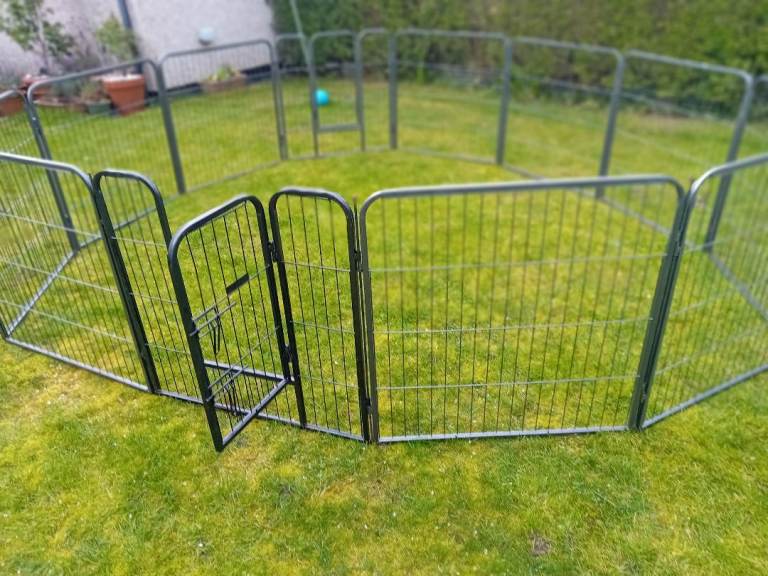 Large dog pen for sale. 12 sides but one could do with a small repair. 10 joining poles. The missing two can be replaced with a bolt or something similar. Can be used in any number of combinations from 4 to 12. Really sturdy piece of kit. Panels 760mm wide by 800 high. Leave your puppy in a secure space. Bargain