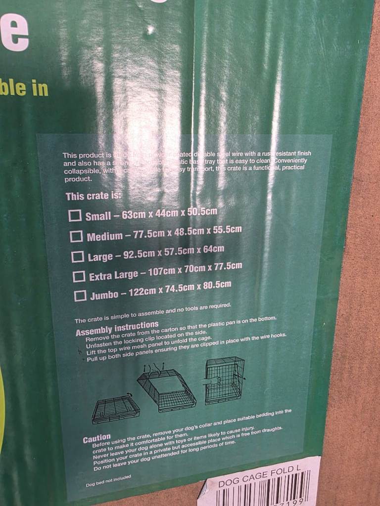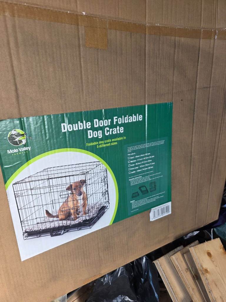 I have 2 large dogs crates available. One of which is only a month old. Both have double doors and removable trays and collapsible.