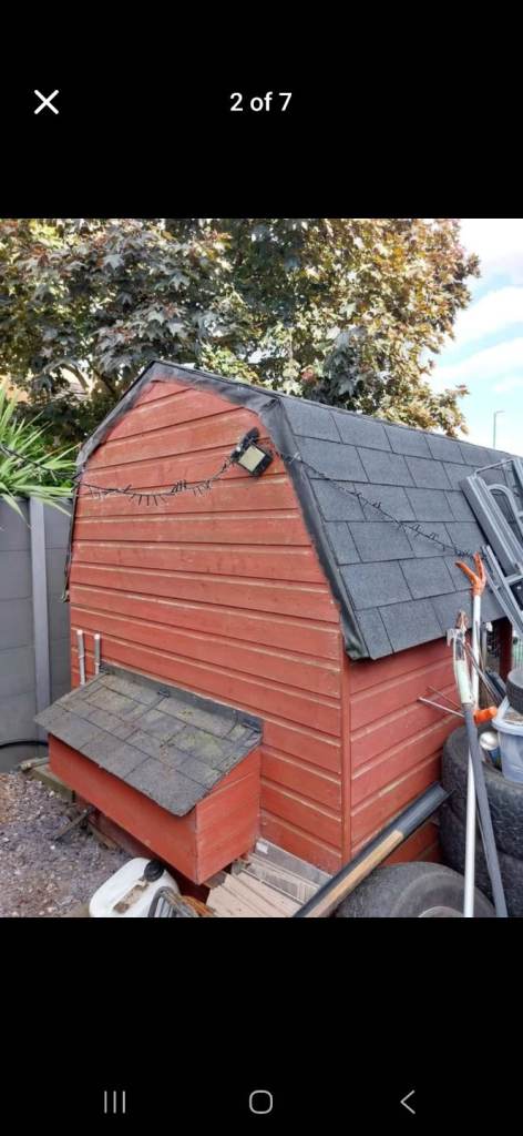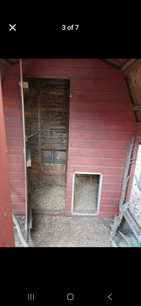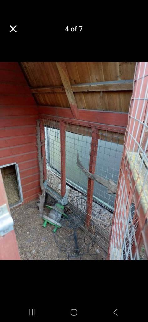 Large walk in chicken coop. Was originally a duchy farm dog kennel, we put a layers box on the back for the chickens to lay eggs in/roost but could be used as a dog kennel again if wanted for that purpose.