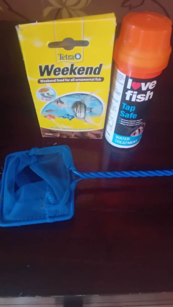 Has 4 colour lights to choose from with remote, fish net, tap safe liquid, weekend feeder pellets and some food.