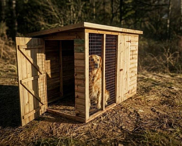 This medium kennel features durable 12mm shiplap construction with pressure-treated wood and a 12mm tongue-and-groove floor in the kennel area. Designed with 45mm x 28mm framing, strong welded mesh on the front, a side door into the run, and a front door into the kennel, it offers a practical layout with a 5ft eaves height and a 4 x 4 kennel size.