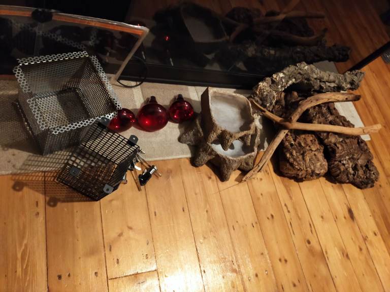 - Assorted tank furnishings, resin water dishes, bulb guards, locks, bark and branches. (All pictured)