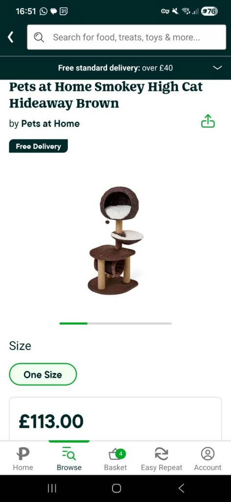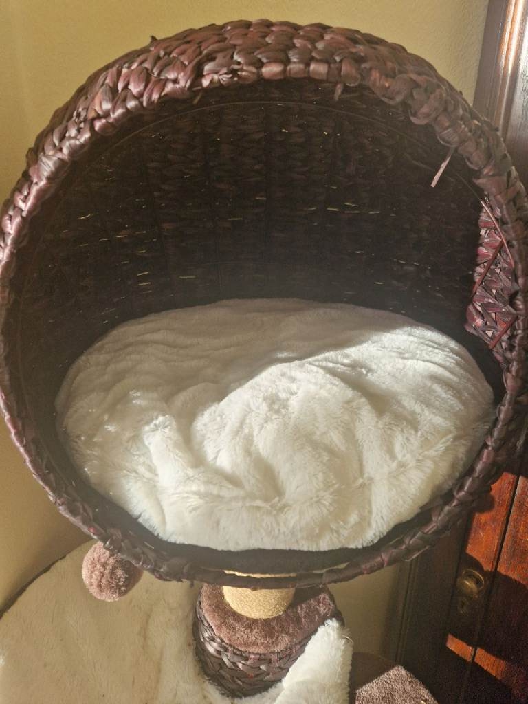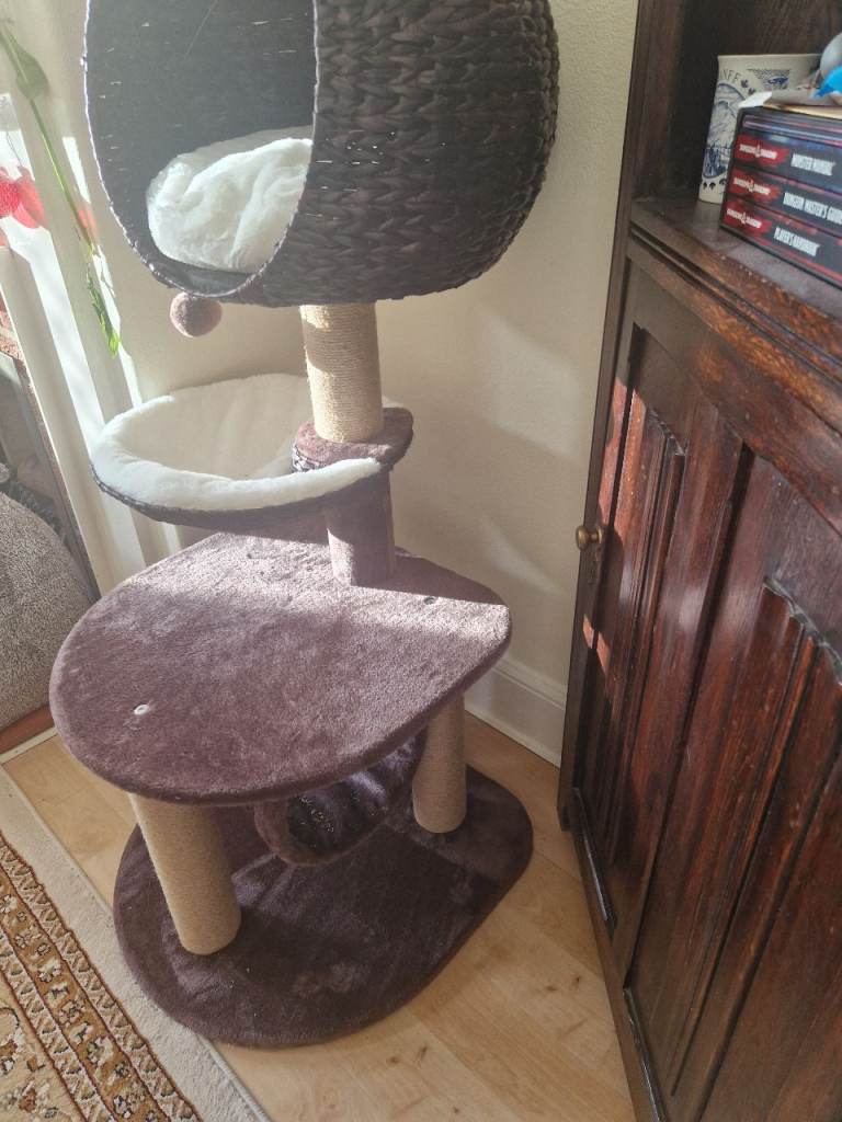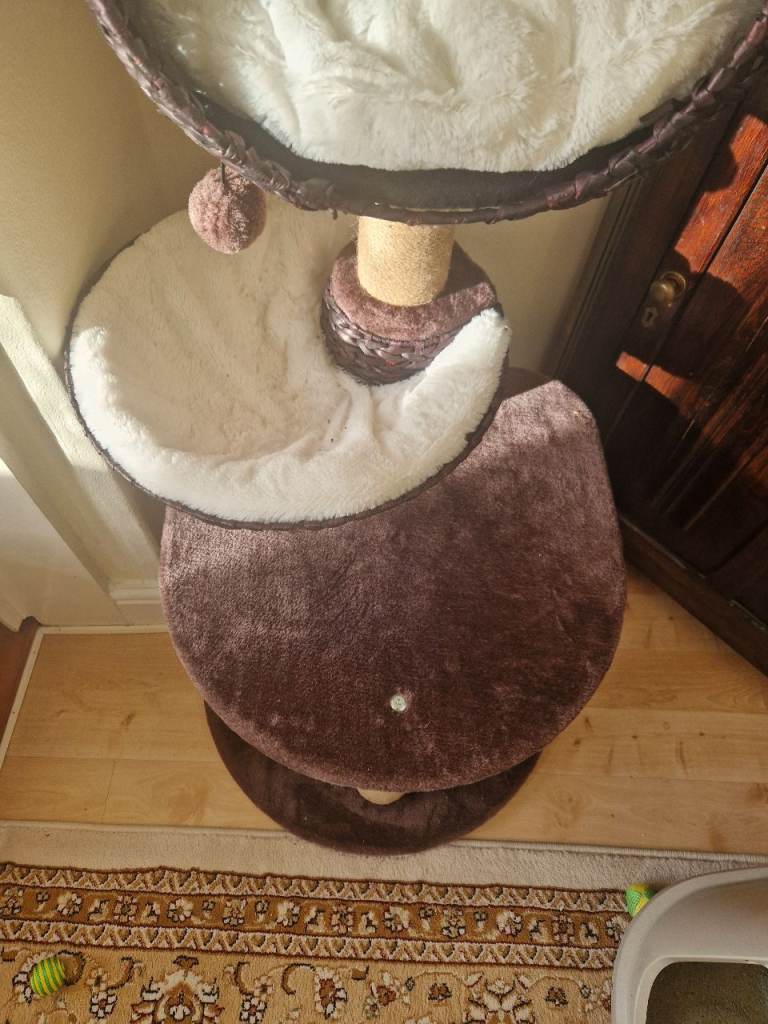 Basically new cat tree bought from pets at home. Lovely design and soft cusions. I bought it as we were getting a new cat but we ended up adoping a disabled cat with 3 legs which cannot climb on it so it is unused. See last picture for reference.