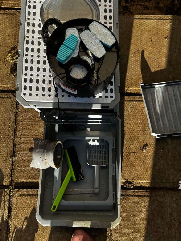 1. cat water fountain with 5 spares filters and 2 spare buffers, 2. litter box/house, with doors and tray, 3. tray scoop, 4. silicon cat/dog hair brush for surfaces. Comes with free gifts: