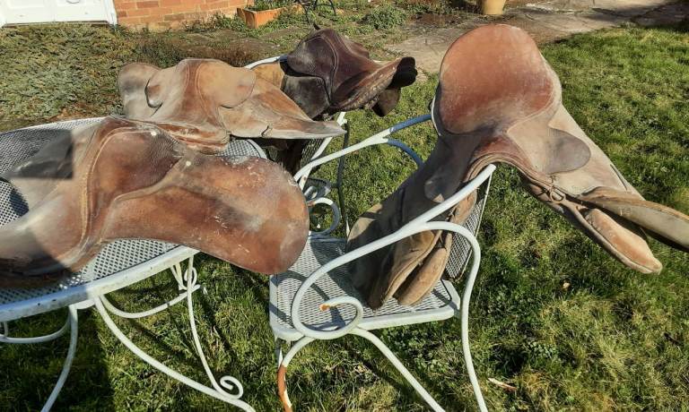 Job lot of 4 old saddles and some harness. They need either complete restoration or repurposing. E.g the leather restored and made into something else. I have put a price of £100.00 but will consider offers. Thank you.