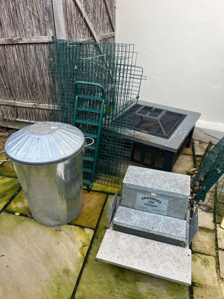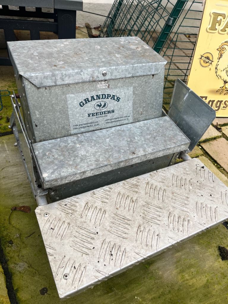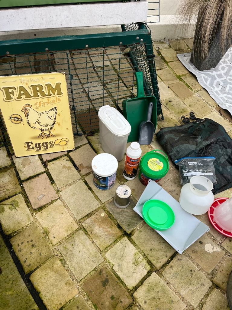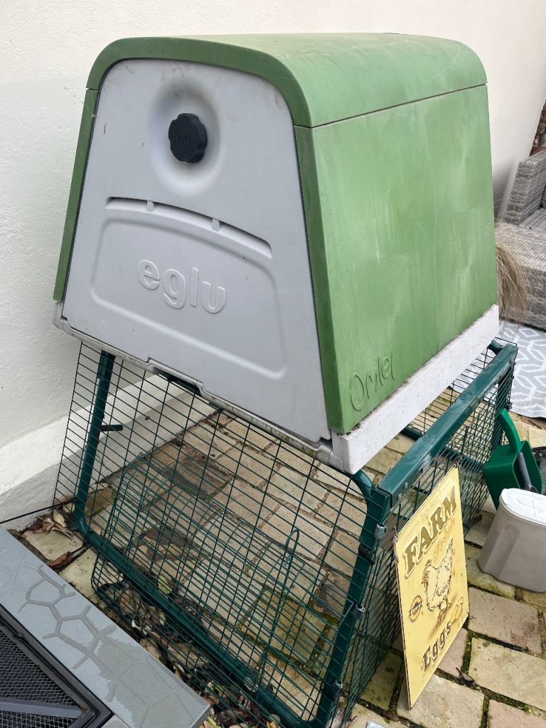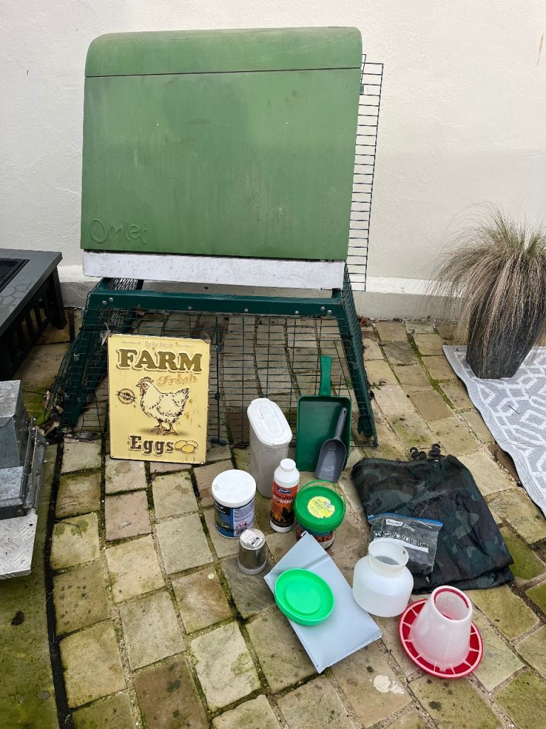 Set up to include Omlet coop, run, galvanised feeder, galvanised bin to store feed in, various feeders & water holders, chicken sign & Omlet booklet.