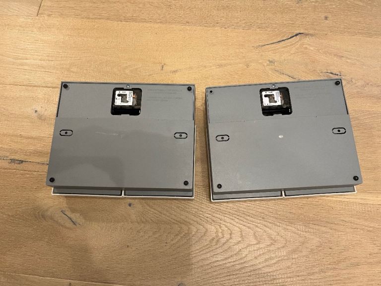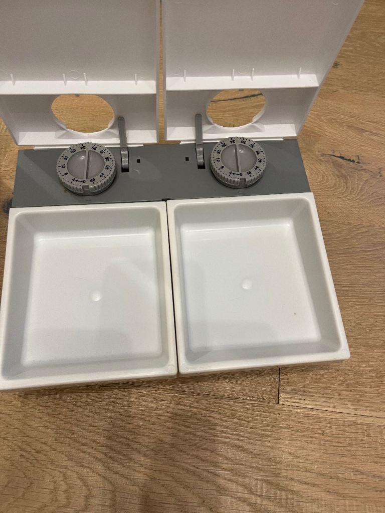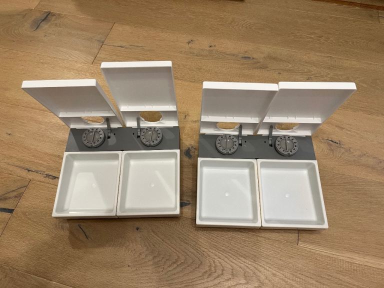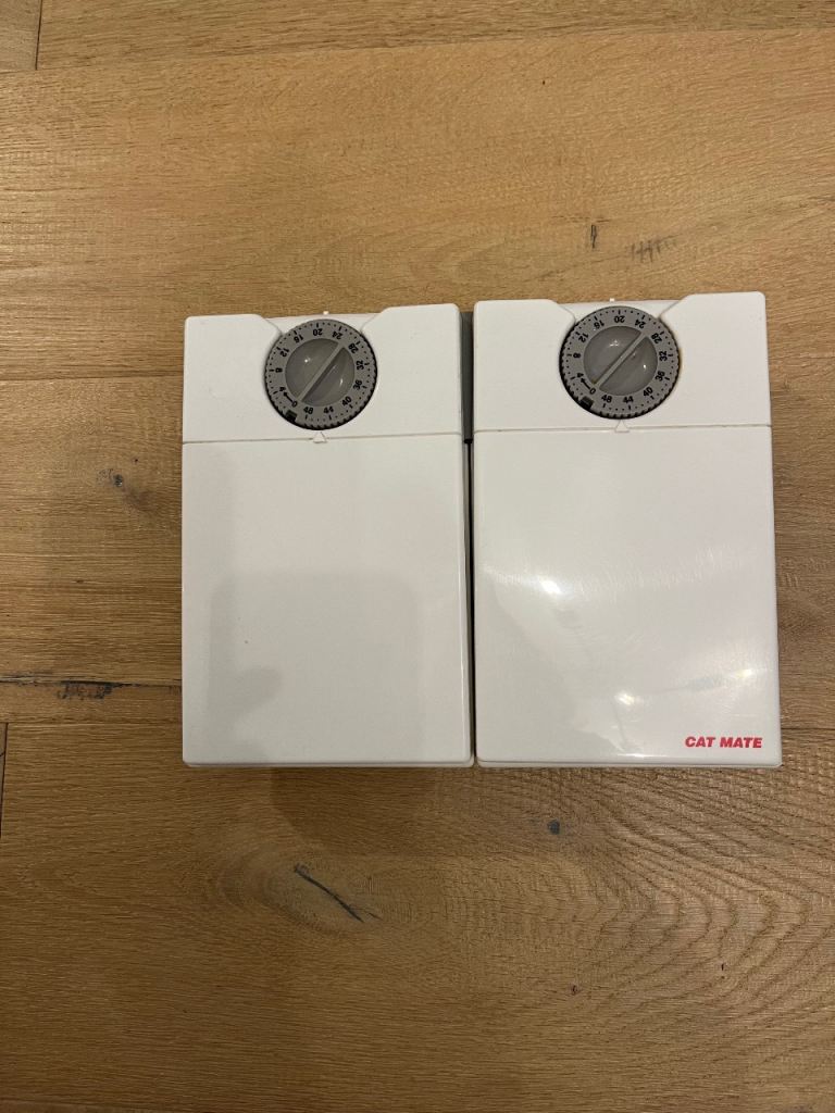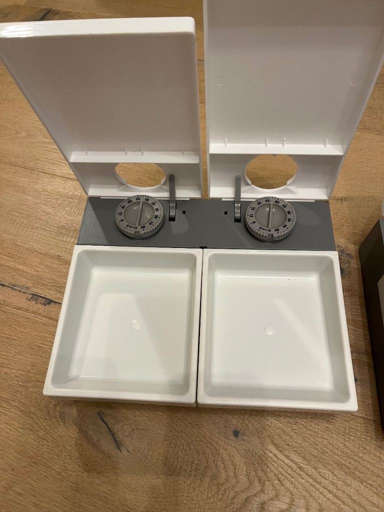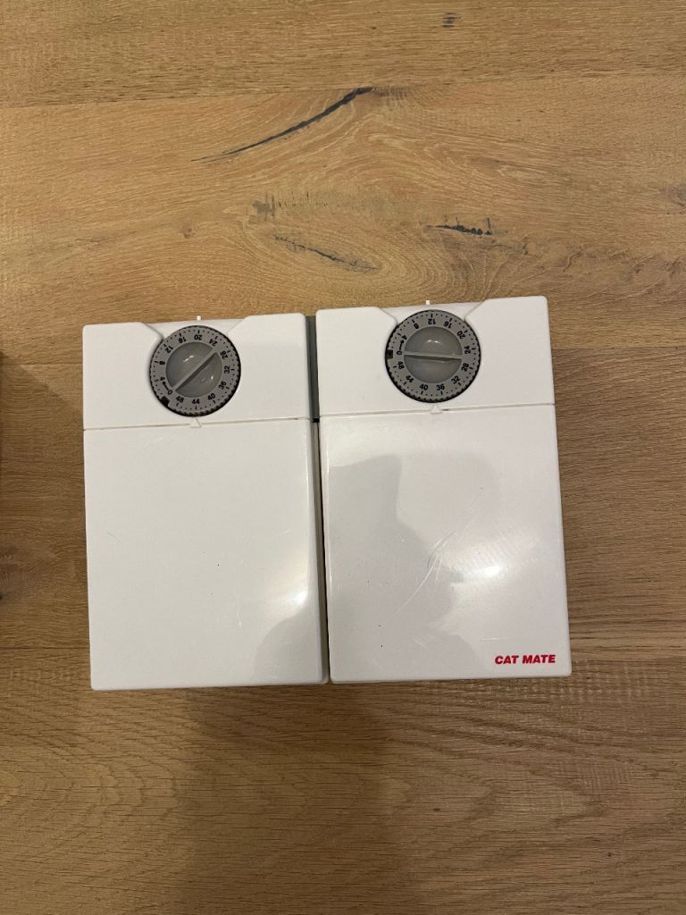 A pair of Cat Mate Two-meal Automatic Pet Feeders. Each features two separate timer-operated compartments, which open to serve wet or dry food at the times of your choosing. They come with reusable ice packs to keep food cool on warmer days. There can be a gap of 48 hours between the servings.