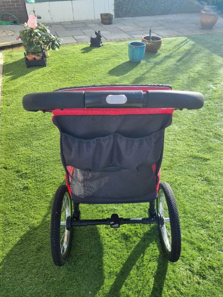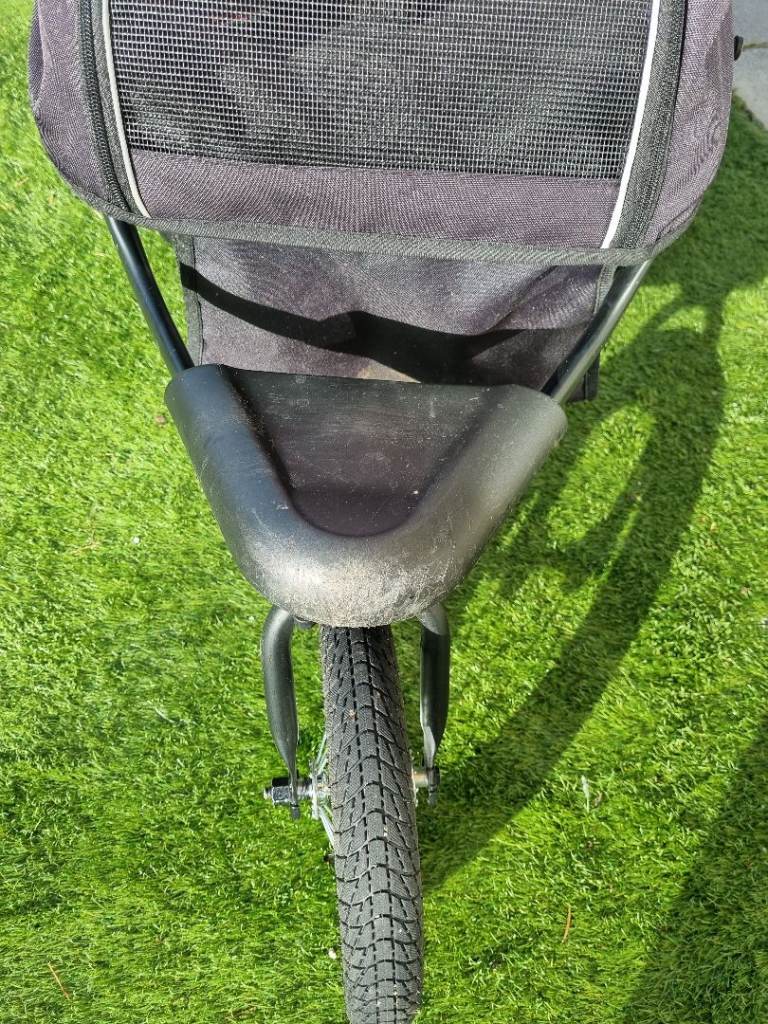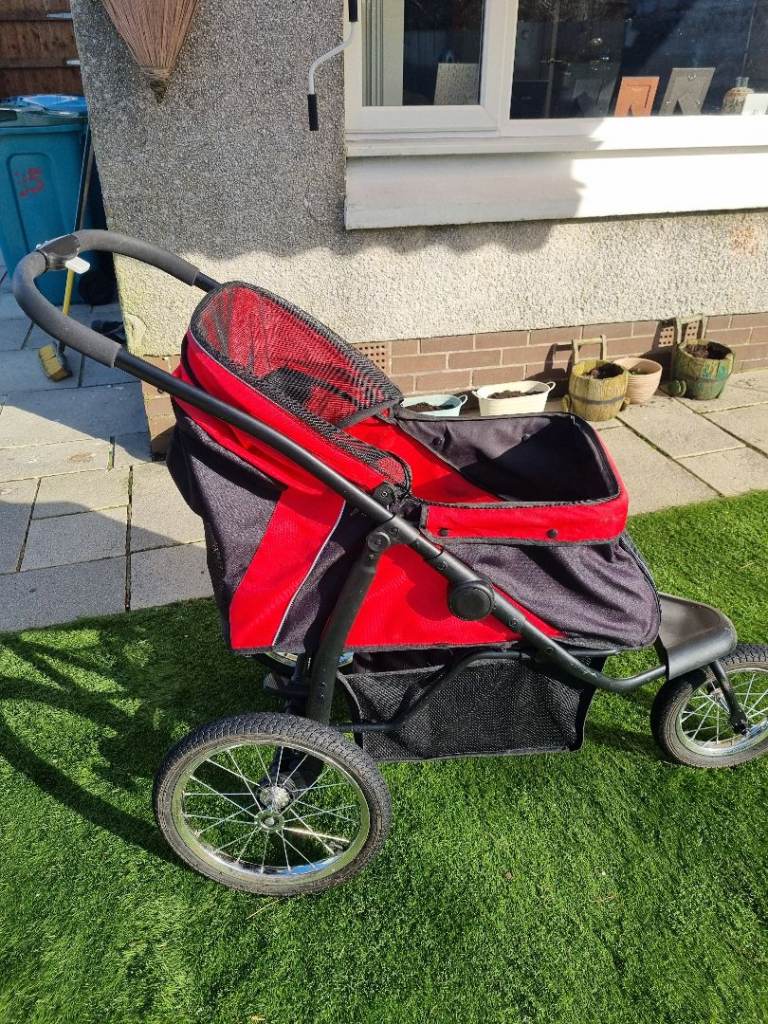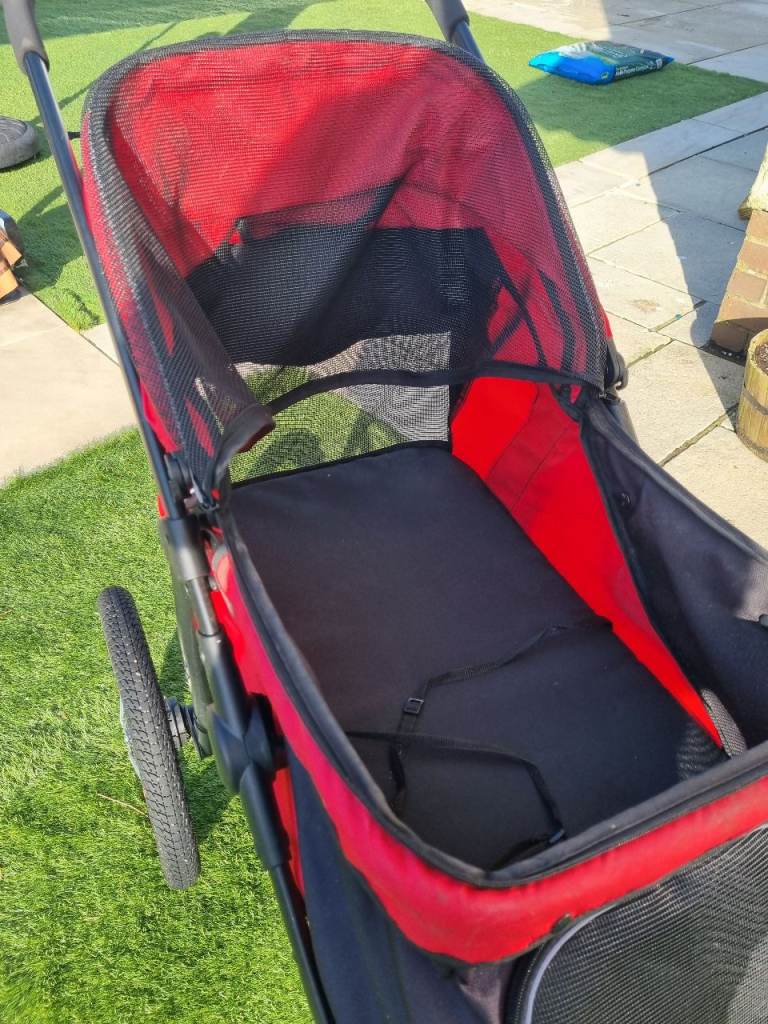 A dog buggy that was in use for one year. Paid £140. Two pockets at the back, harness for dog safety, brake. Has a few scratches at the front as in picture. Our dog was 15kg and was comfortable in the buggy. £40
