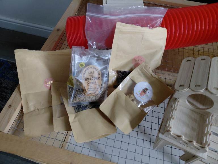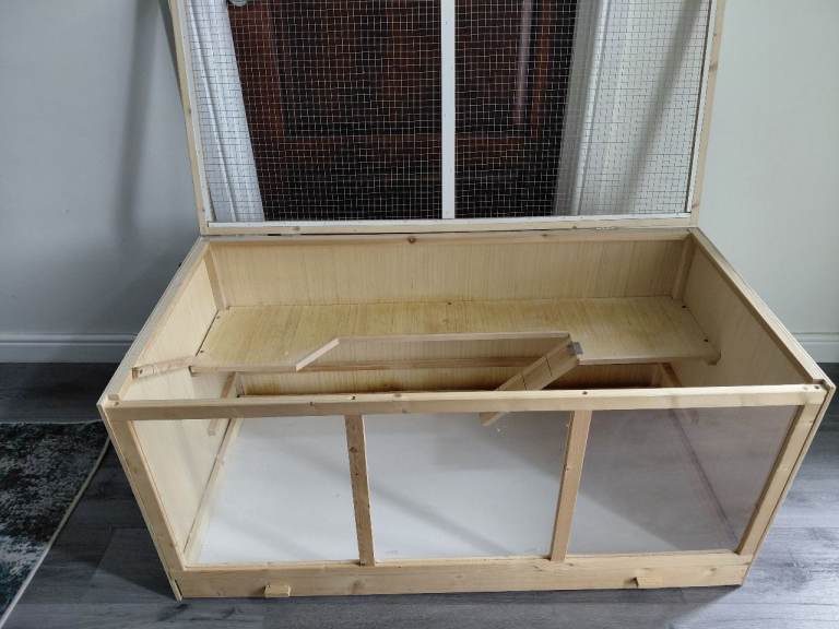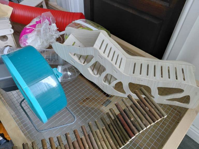 Large pawhut cage 115cm long by 57cm wide, by 55cm high. Front plastic transparent windows, wire mesh lid that opens upwards. Initially had 2 inner shelves but I removed lower one to allow for deeper bedding & burrowing. Selection of hamster accessories- wheel, sand bath, hides, tunnels, travel case, play pen for allowing hamster roam/ running time, food & treats. Will sell cage separately.