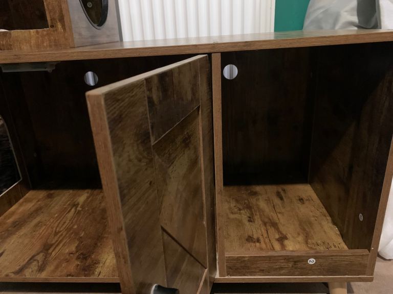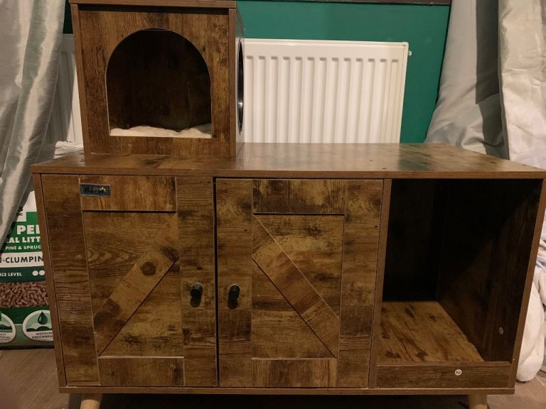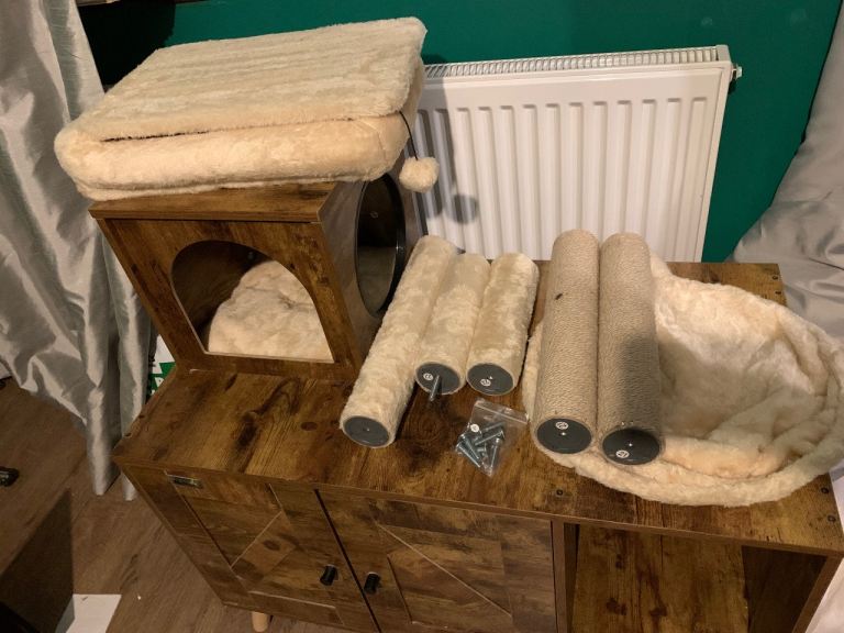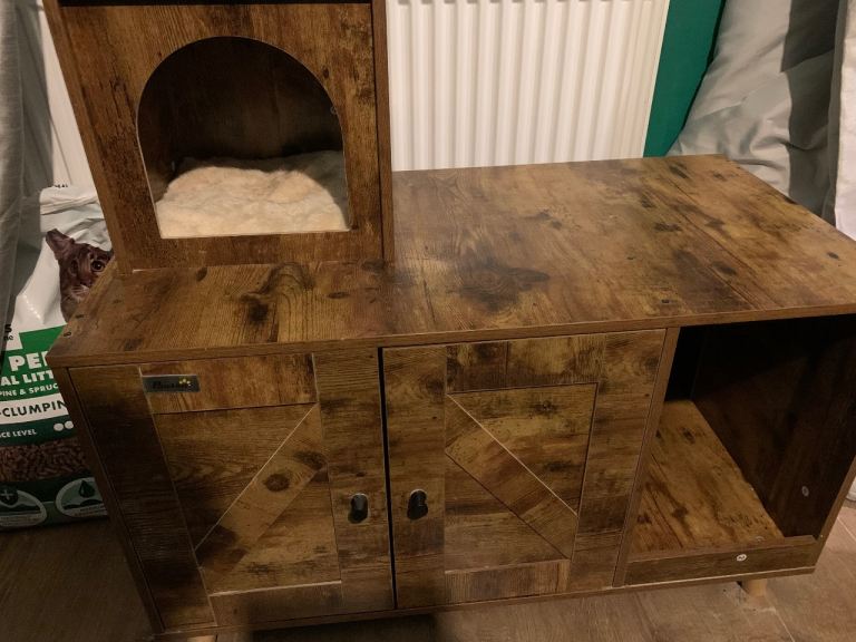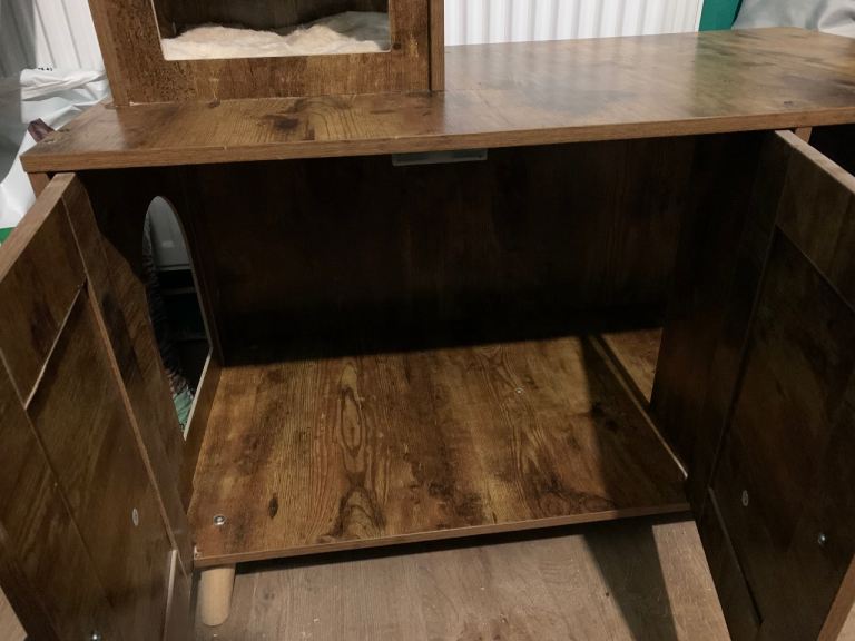 The cat tree has never been used, it has never been set up. The enclosure was used as a hideout for the cat, not as a litter box enclosure. I have given it a wipe down and it’s in great condition.