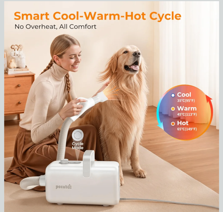 Pecute Dog Hair Dryer, Dogs Dryer Grooming Fast Drying, High Power Hot & Cold Cycle, Dog Grooming Kit with 4 Nozzles, Low Noise Pet Hair Dryer for Cats, Furminator for Dogs