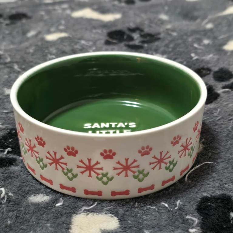 "Santa's little helper" christmas design pet food bowls. Have only ever had dry food in them. Dishwasher safe.