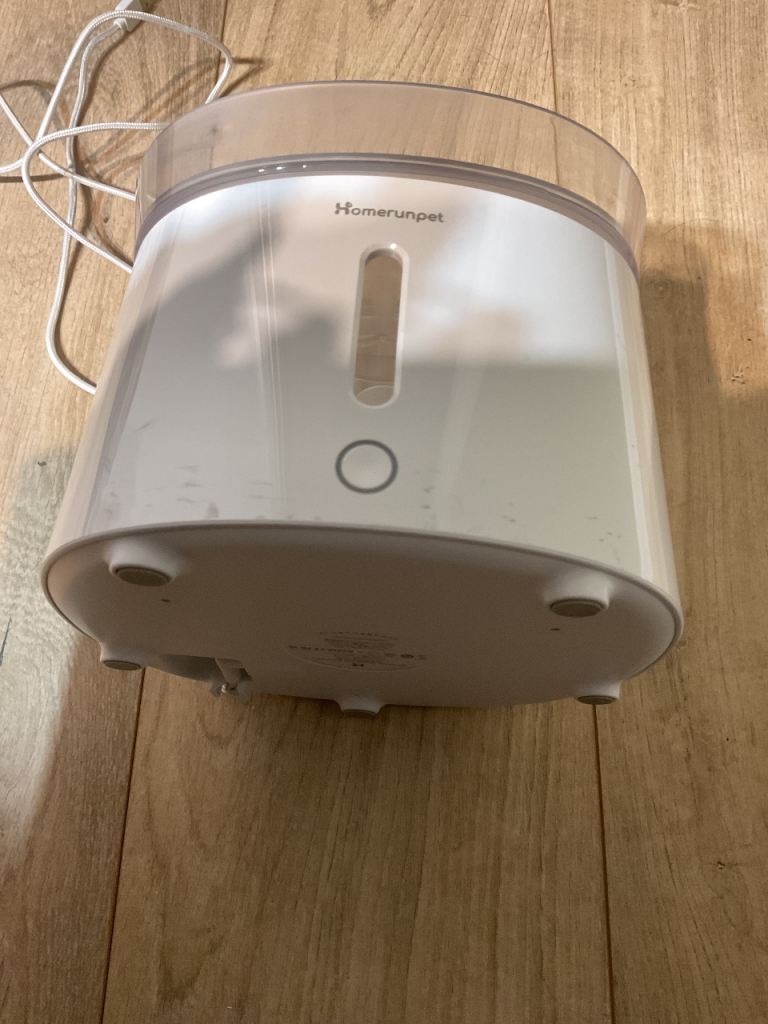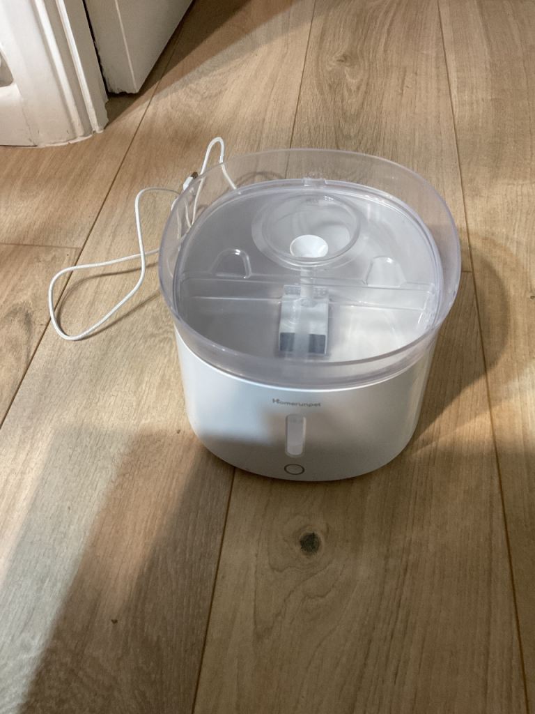 Homerunpet water fountain with 2 filters and 1 sponge motor filter (extras sold on Amazon). Clean and working, last pic shows crack on cover, pull tab missing from drinking plate but plate can still be lifted off, scratches to main unit in 2nd pic. Easy to assemble and take apart. USB cable keeps it running. 2l. Approx 19x19xh16cm.