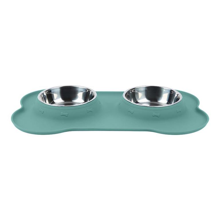 Non-slip, bone-shaped diner with removable, dishwasher-safe stainless steel bowls for easy cleaning and reduced mess.