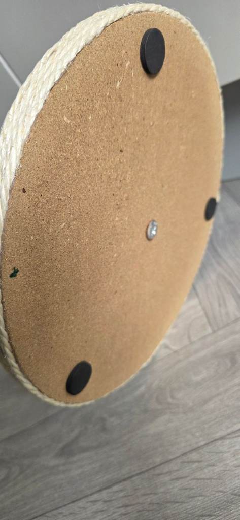 Design: A vertical scratching post made from natural sisal rope with two integrated bump sections and a dangling ball for interactive play.