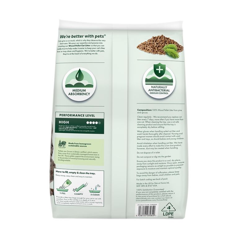 This Pets at Home Wood Pellet Non-Clumping Litter With Natural Pine and Spruce Aroma is a High performance cat litter made from Grown in Britain certified wood sourced from sustainably managed forests in Britain. These pellets support the environment, being a by-product of wood processing and naturally biodegradable. This litter offers medium absorbency, natural anti-bacterial properties and odour control. It is also lightweight and virtually dust free and being gentle on your cats paws.