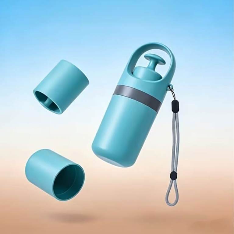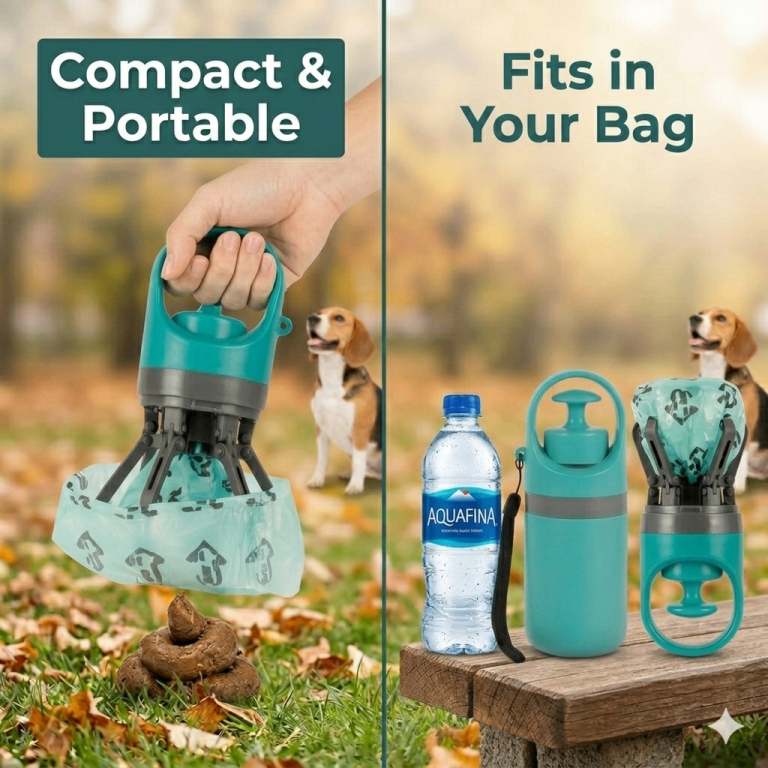 Our Portable Claw Poop Scooper combines a bag dispenser and a mechanical grabber into one sleek, water-bottle-sized tool.
