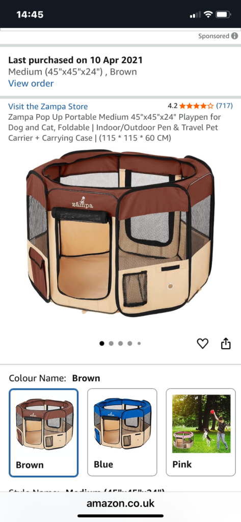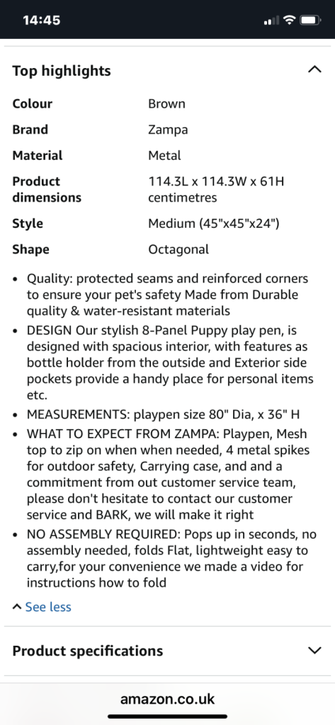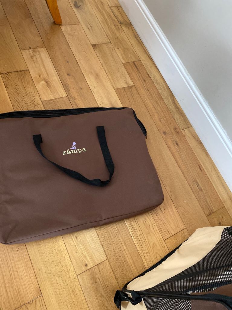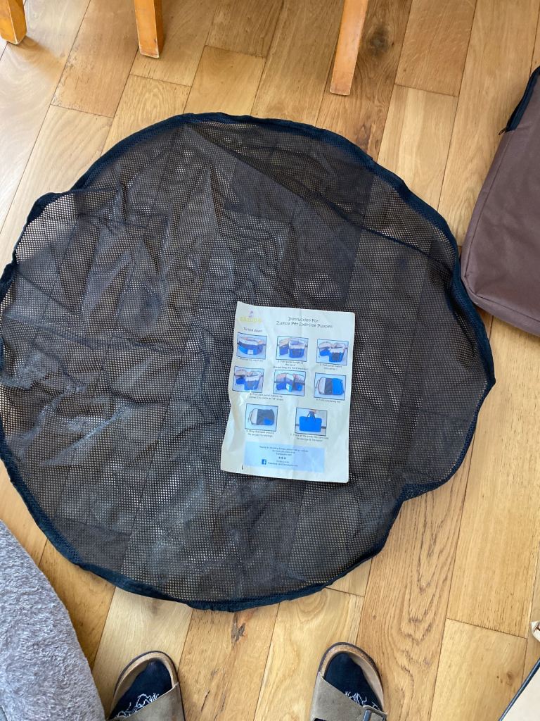 Pop up Zampa puppy pen in immaculate condition. Complete with mesh roof(removable), handy carry bag and instructions for use. Octagonal shape, medium sized pen measuring 80 inches in diameter and height 36 inches. Easy wipe mat on bottom. Looks great and fantastic for puppies and small dogs.
