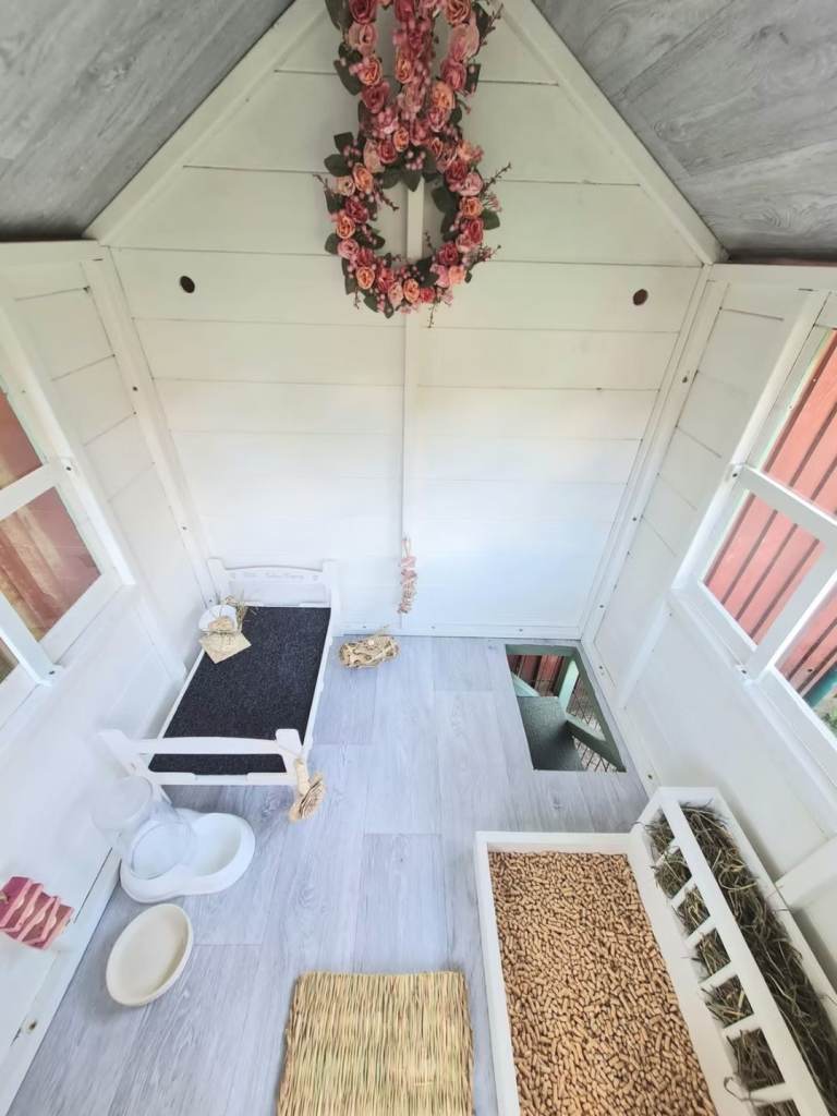 House itself is custom to suit rabbits. It's elevated to maximise space underneath and comes with a large run that sits to the side.