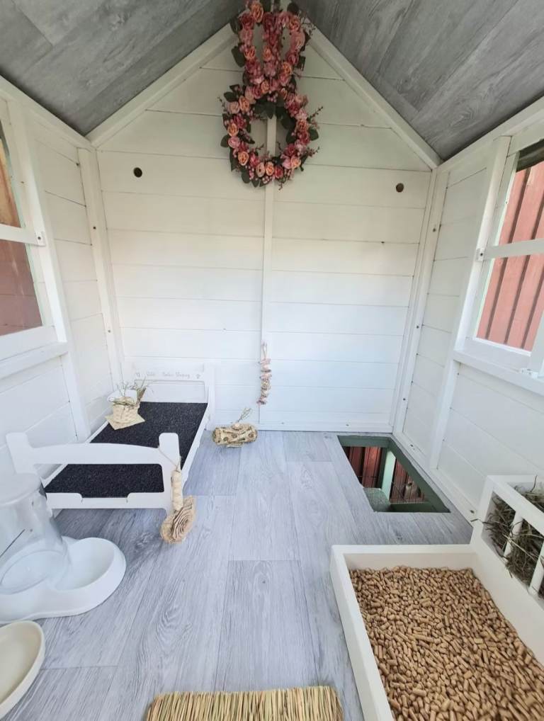 House has had a new roof and felt, new floor, painted with cuprinol inside & out so safe for pets, floor and inside roof is lino for very easy cleaning, walls are easily washable. Inside is in very good condition.