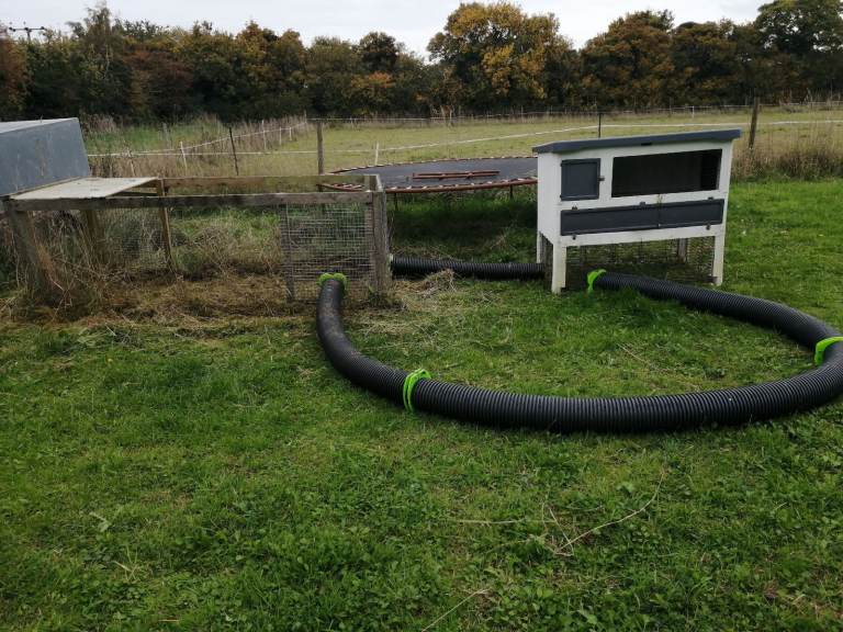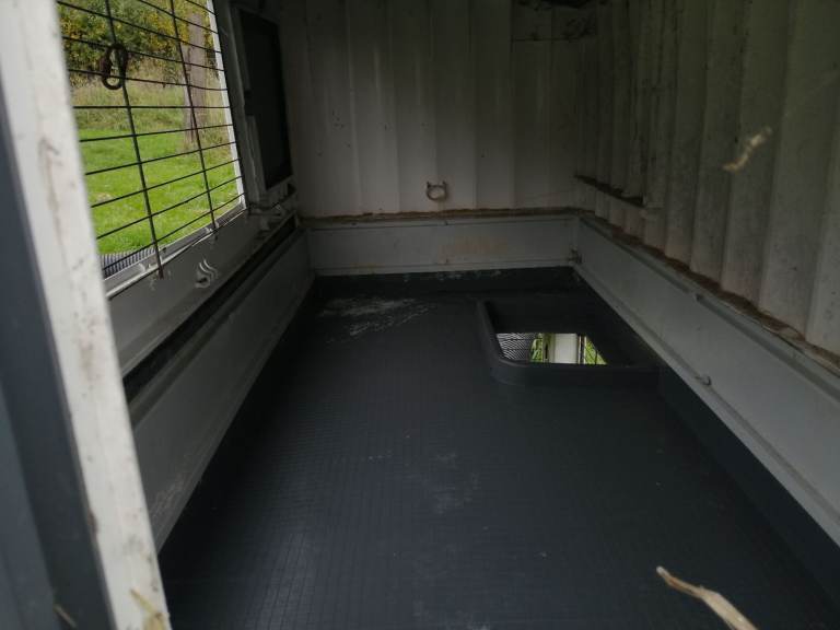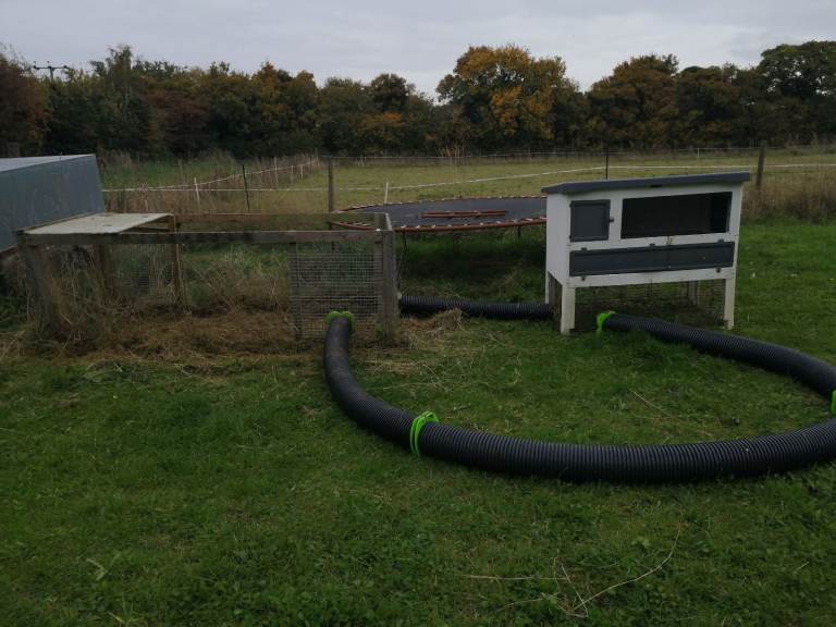 Plastic two tier rabbit hutch with removable bedding tray complete with tubes to connect to outdoor run.