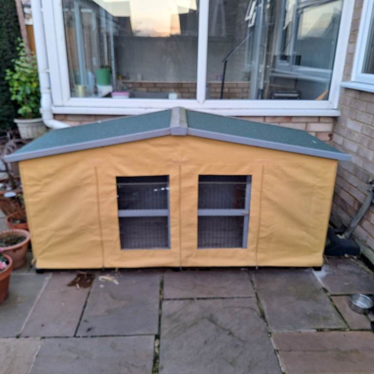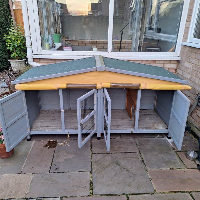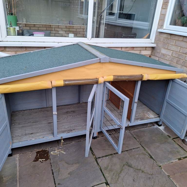 Large rabbit hutch / Run with divide at one end. Nice large space inside. All 4 doors open for easy access. Comes with rain cover that covers entire hutch. Also small window covers for summer use if top cover is removed.