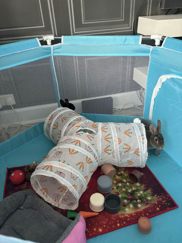 Rabbit hutch solidly built plus 2 small rabbits 16 weeks old comes with straw hay &food hutch was newly built 2 weeks ago