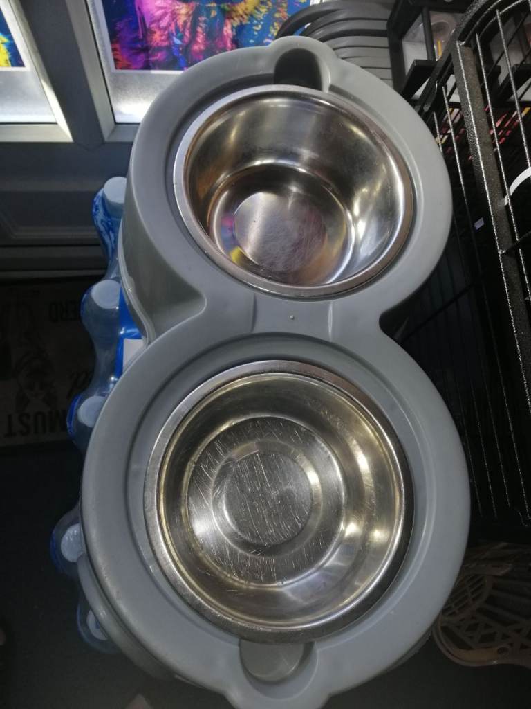 Stand is 45 cm across by 15 cm height with 2 x 15 cm stainless steel dishes. Dishes fit but are not original dishes it came with. Collect Bedminster, text contact preferred No WhatsApp thanks. 2 available one in grey the other in red bases price is each.