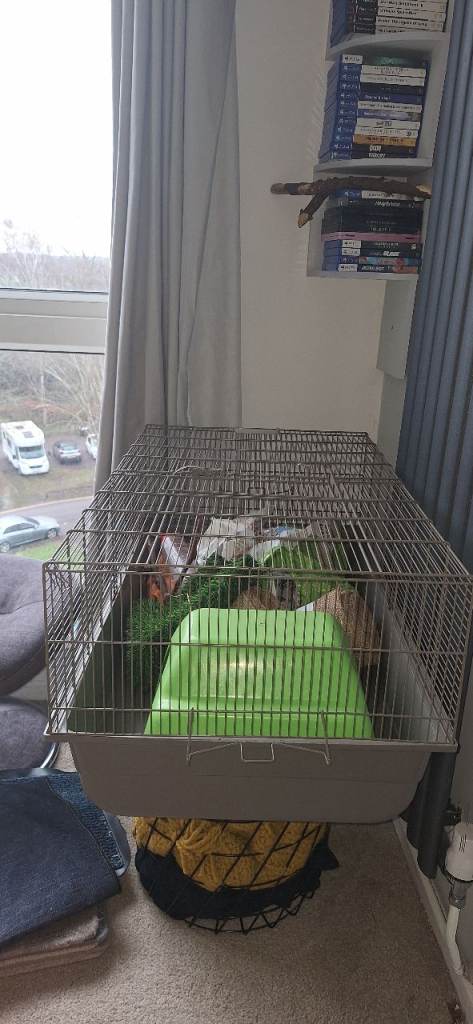 Rat/hamster cage with some bedding and decor bits