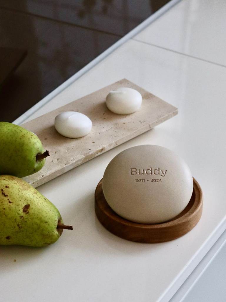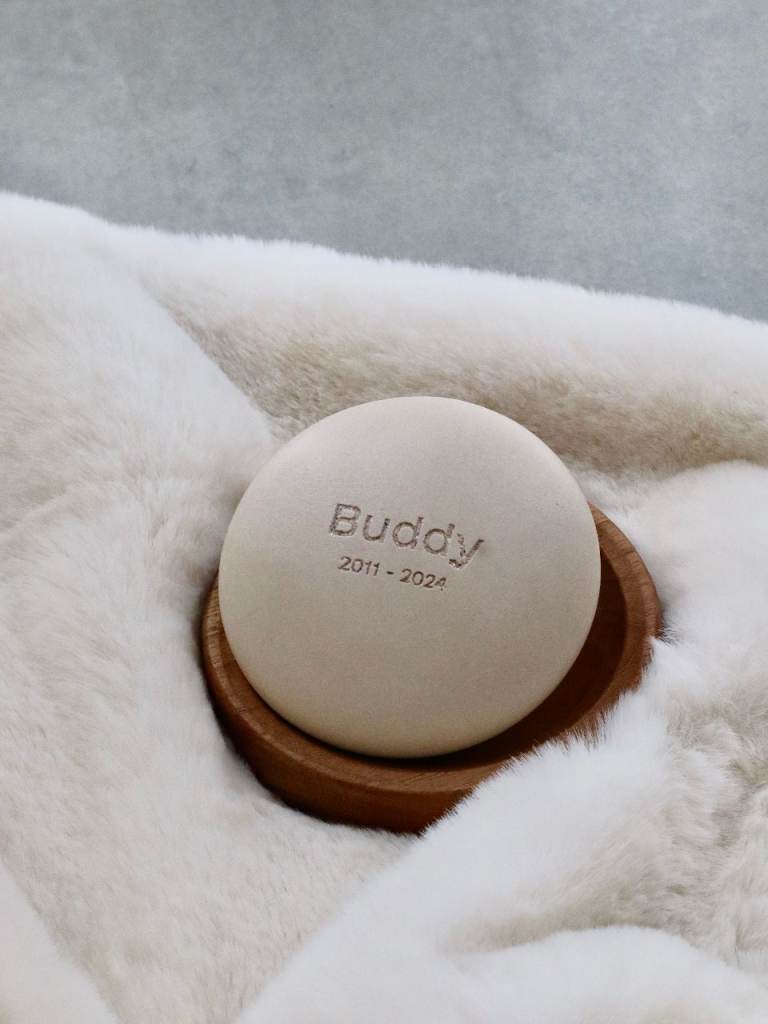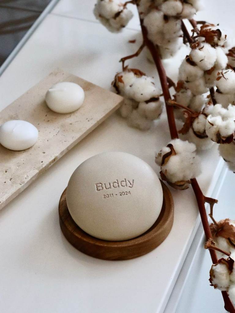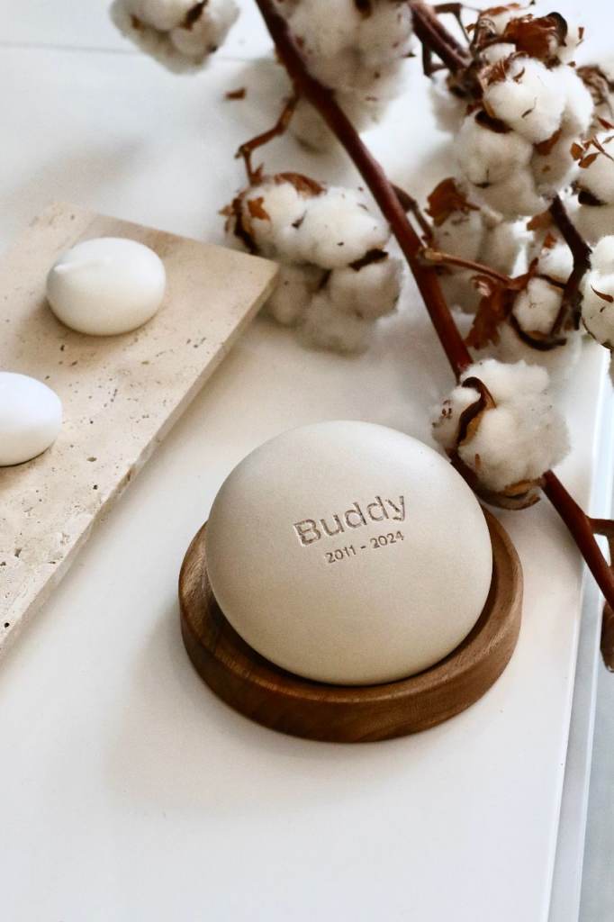 The Remembrance Stone is handcrafted from your pet’s ashes, making each piece truly unique. It preserves memory, symbolises love, and embodies the lasting bond you shared. The pet’s name and years of life are engraved on the stone, while the wooden base adds warmth and a natural touch.