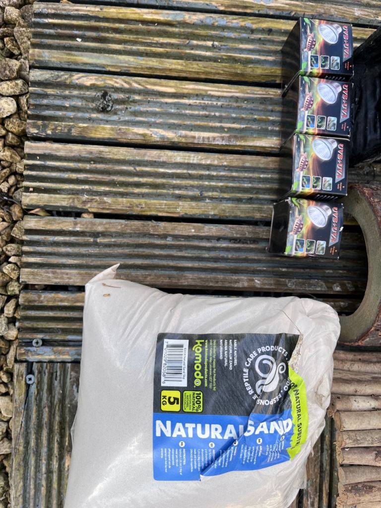 Bulbs, sand, wooden structures and feeding bowls.