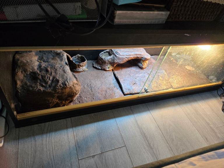 Selling with everything shown added for free as I just want it gone (basking bulb, linear UVB bulb and fixtures, ceramic tiles and cave)