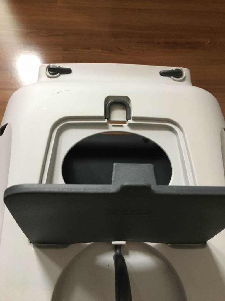 Attachment device at the top for car seat belt. Ventilation slits.