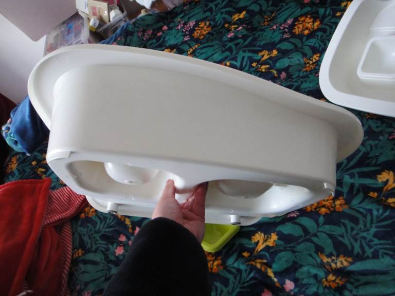 The bottom has two rubber stoppers on the feet to keep the tray in position.