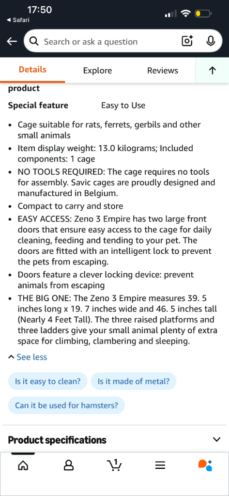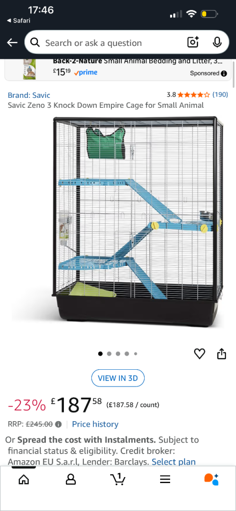 I purchased thinking I was going to get some pet rats but fell in-love with some gerbils instead! This cage is far too big for gerbils and it was too much of a faff to send back.