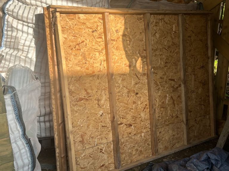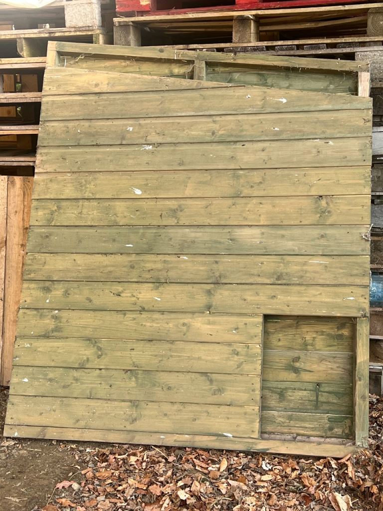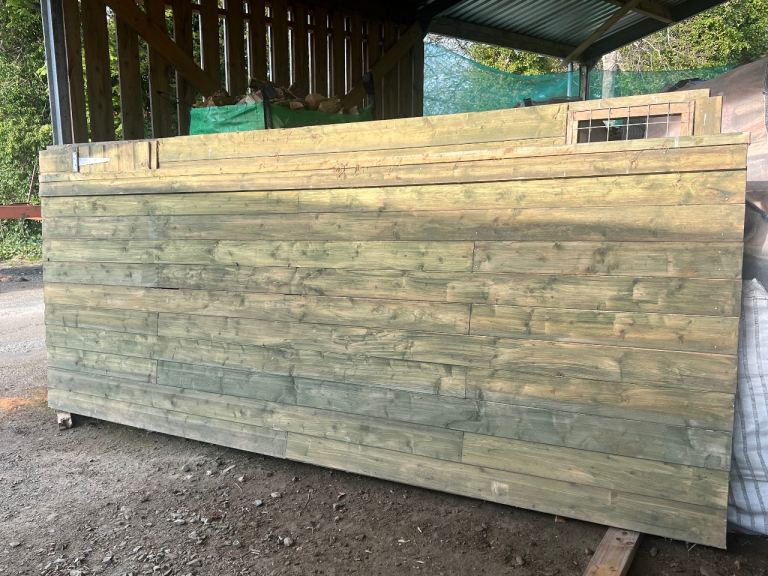 Sectional wooden dog pen and kennel suitable for slab or concrete base. Easy assembly. 4m wide and 1.4m deep with sloping roof at 1.75m back to 1.42m. Unused.